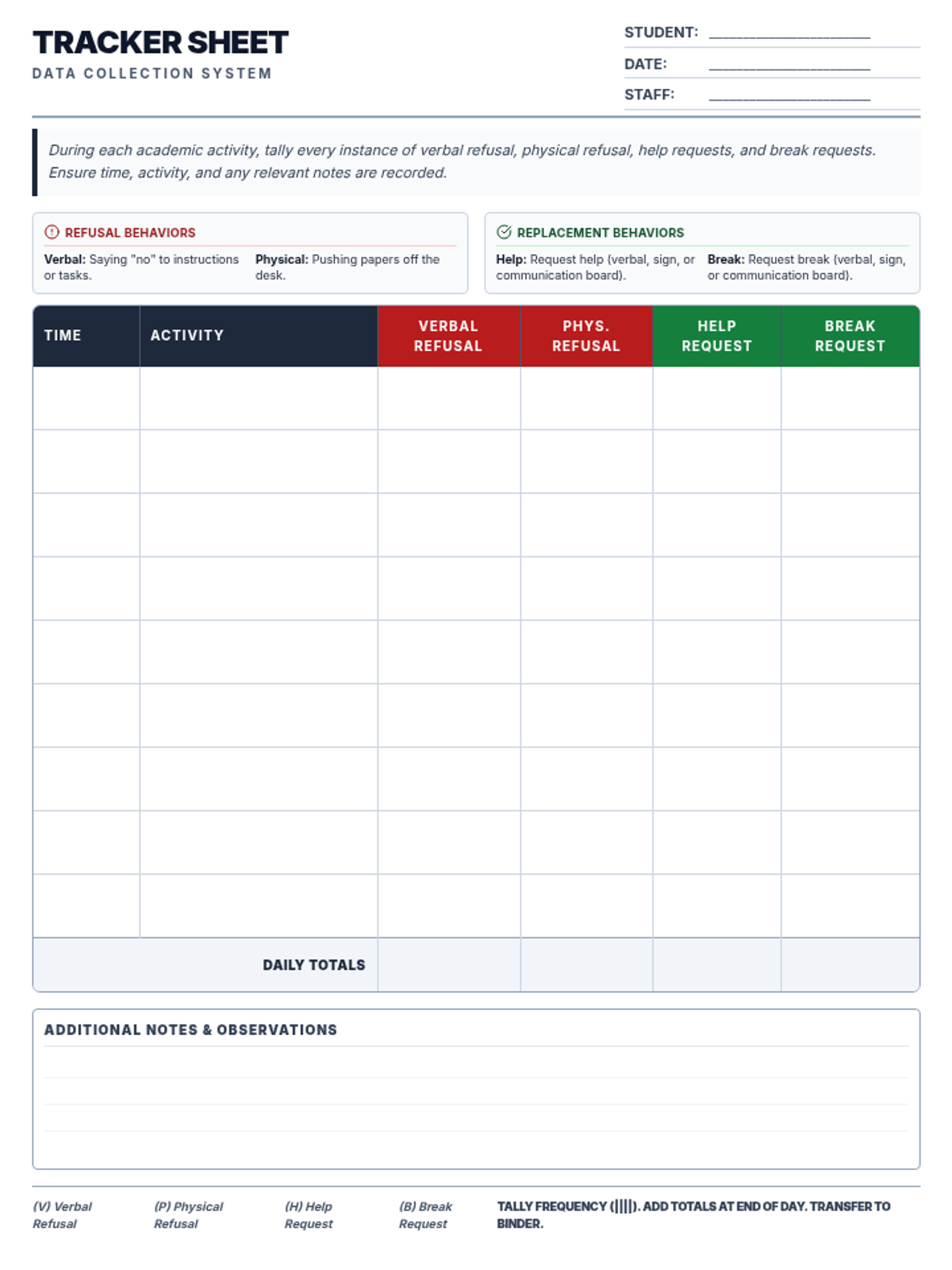 A professional behavior tracking document with specific definitions for refusal behaviors (saying no, pushing papers) and replacement behaviors. Features a 9-row frequency tracking table and a dedicated summary notes section at the bottom for detailed observations.