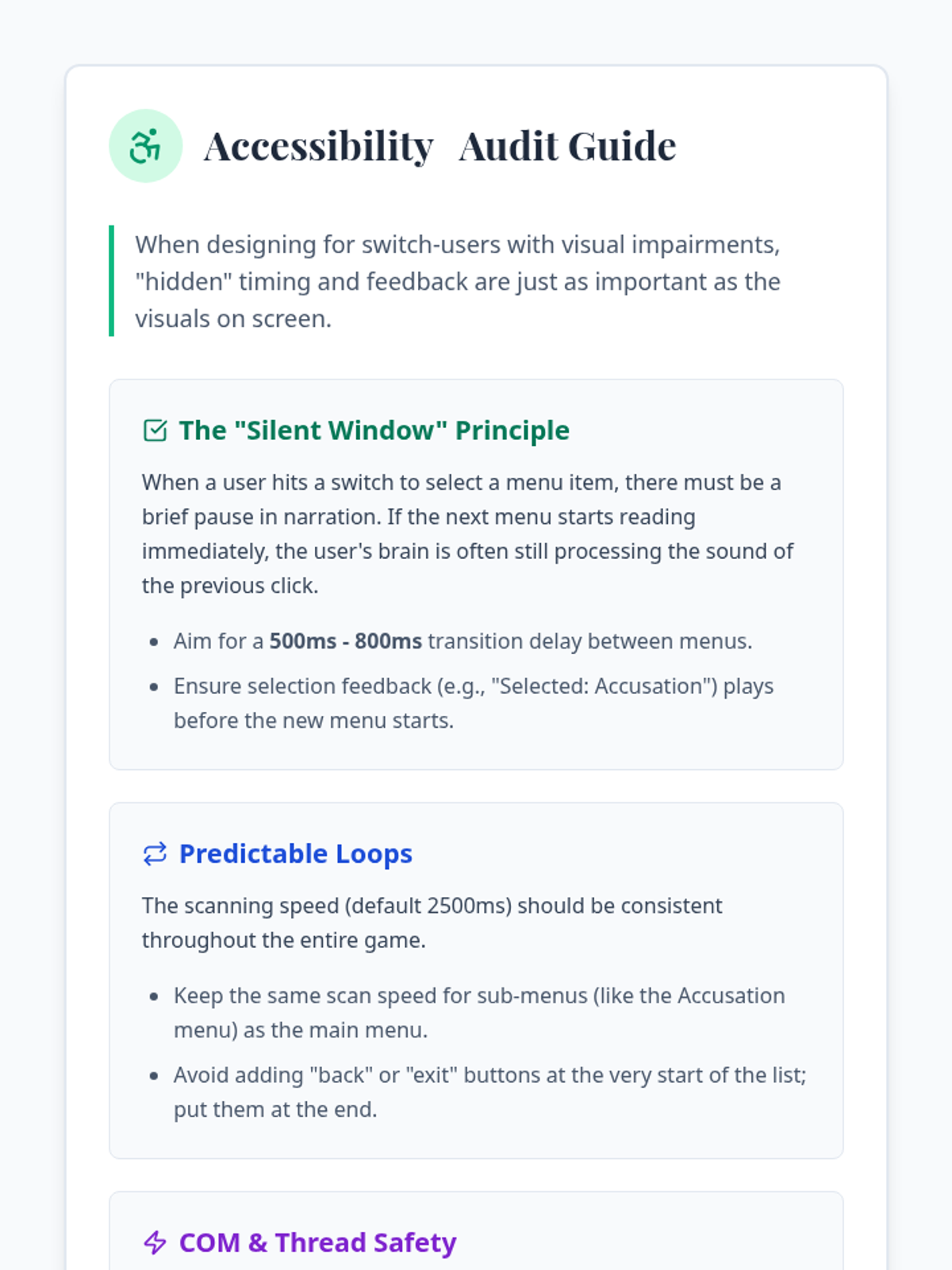 A teacher-facing resource outlining the best practices for timing, feedback, and thread safety when developing switch-accessible games for visually impaired students.