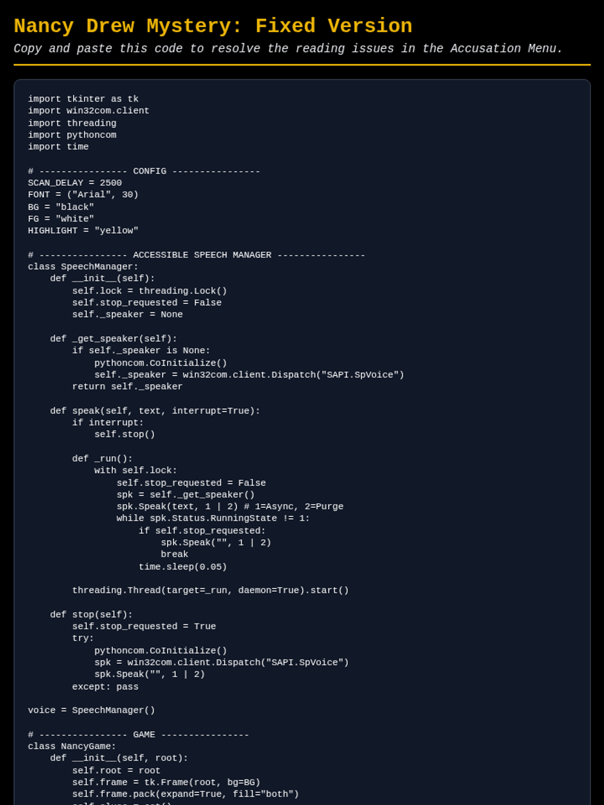 The fully corrected Python source code for the Nancy Drew Mystery Game, featuring a robust SpeechManager class and improved transition timing for switch accessibility.