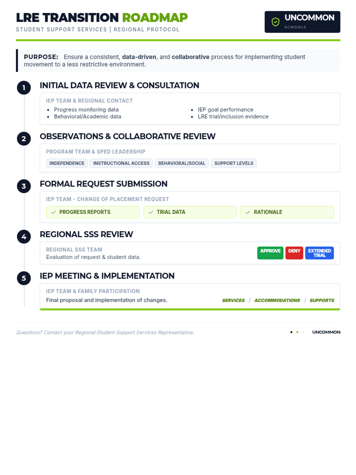 A condensed one-page professional guide for school IEP and CST teams outlining the 5-step process for transitioning students to a less restrictive environment, optimized for single-page printing with Uncommon Schools branding.