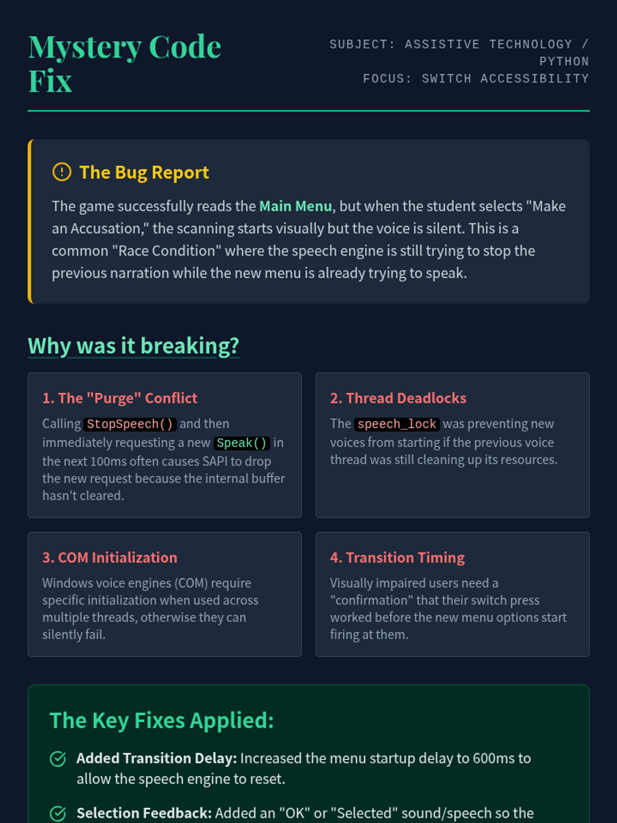 An explanation of why the original Nancy Drew mystery game code was failing to read menu options and a summary of the technical fixes required for reliable switch accessibility.