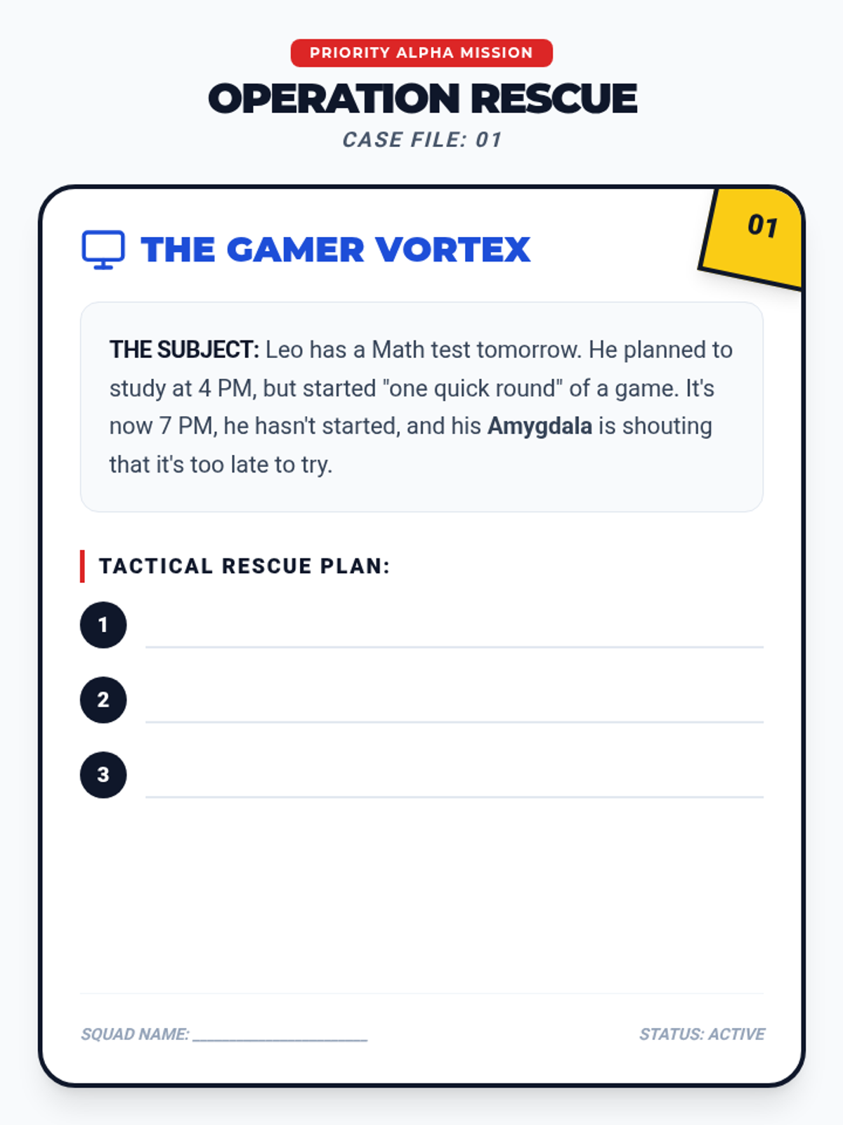 A collaborative group activity where students work in teams to analyze 'Case Files' of procrastination scenarios and create tactical rescue plans using lesson strategies.