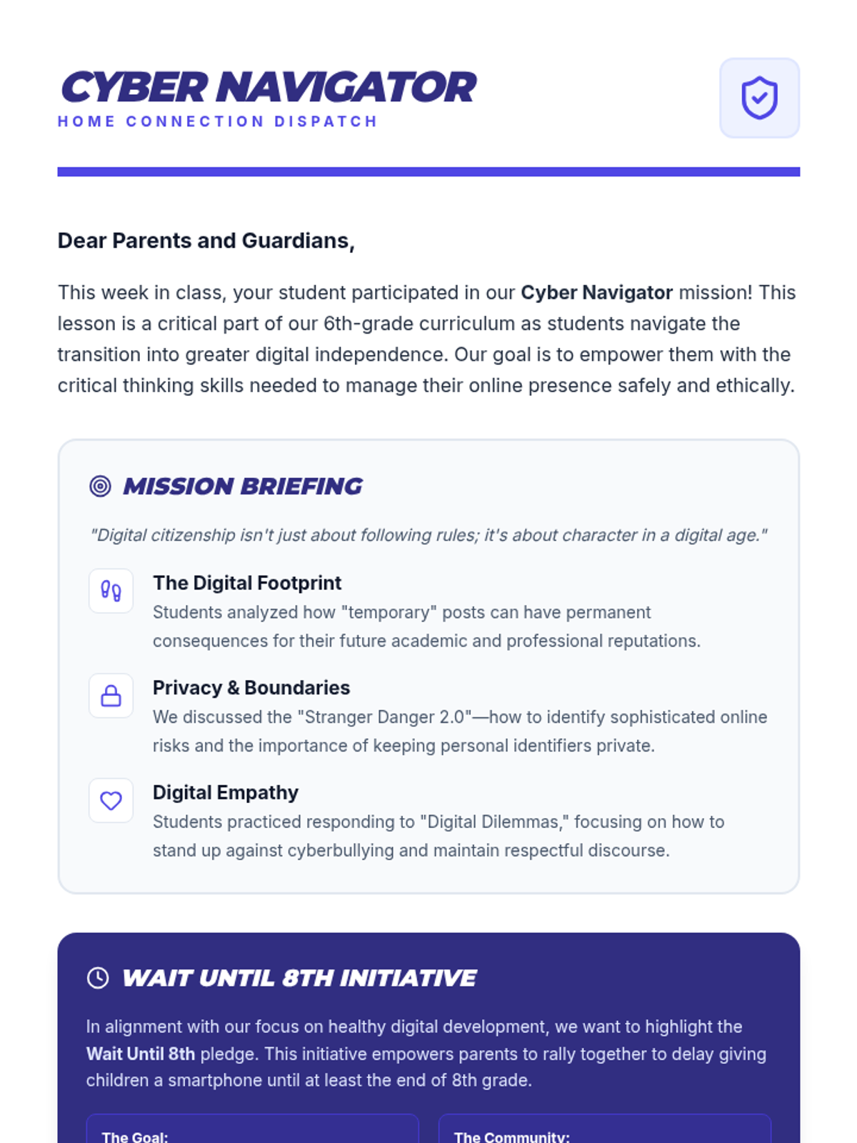 A professional and themed letter for parents and guardians, detailing the core concepts learned in the Cyber Navigator lesson, including information on the "Wait Until 8th" initiative and home conversation starters.