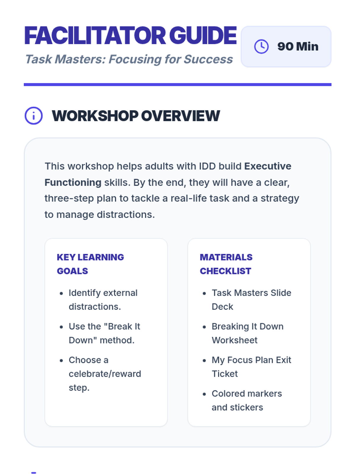 An instructional guide for educators teaching the Task Masters workshop, featuring a 90-minute timeline, facilitation tips specifically for adults with IDD, and lesson objectives. Revised for better layout and instructional depth.