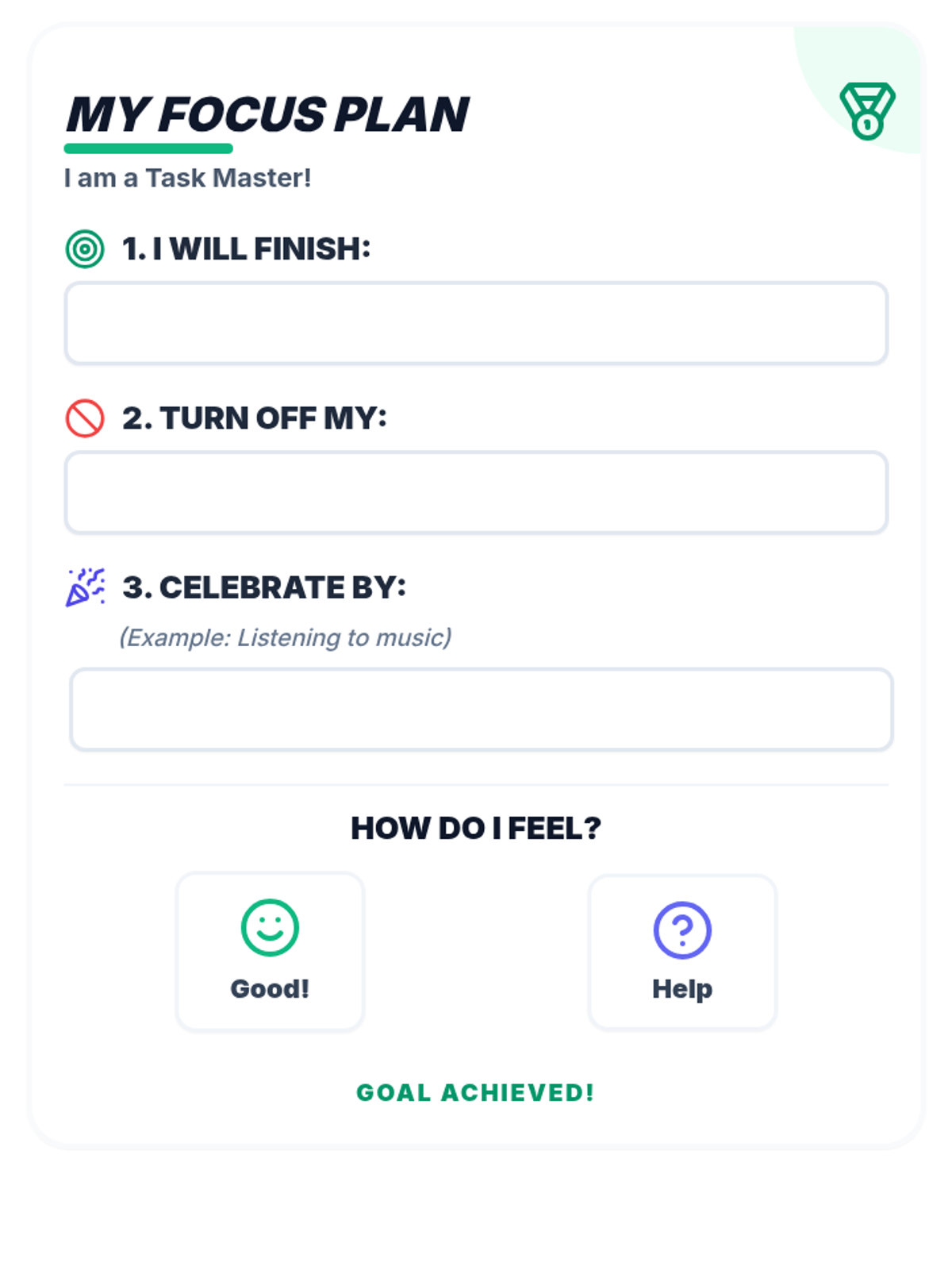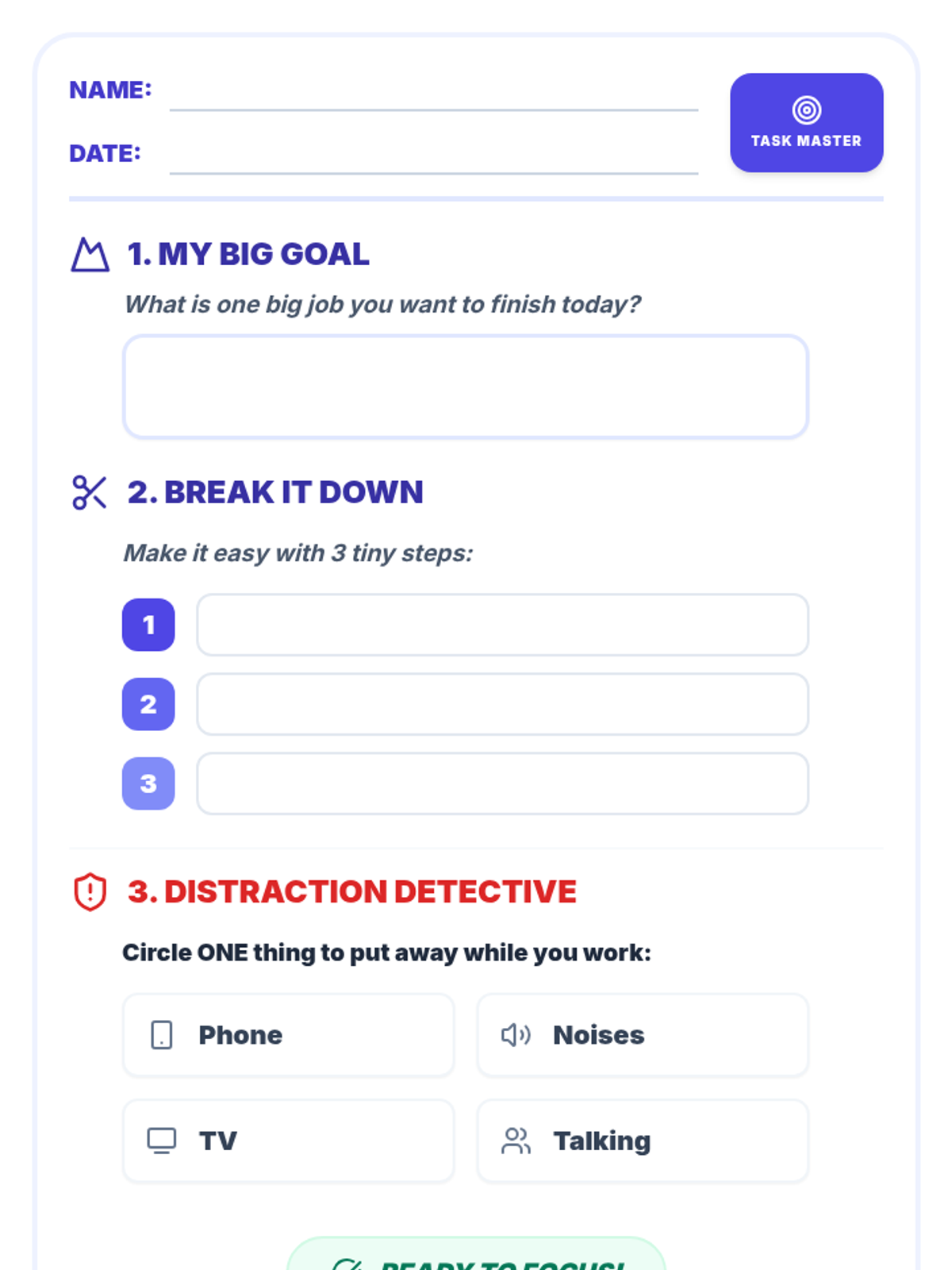 A visual worksheet for adults with IDD to practice breaking down a big goal into three manageable steps and identifying potential distractions. Revised for clarity, uniform styling, and accessibility.