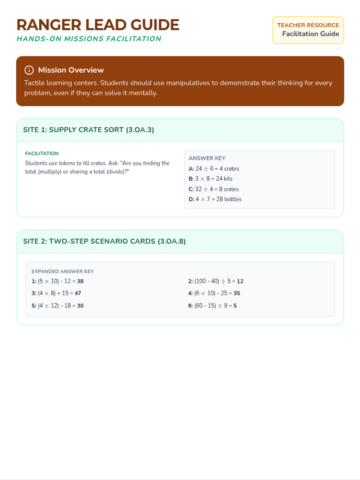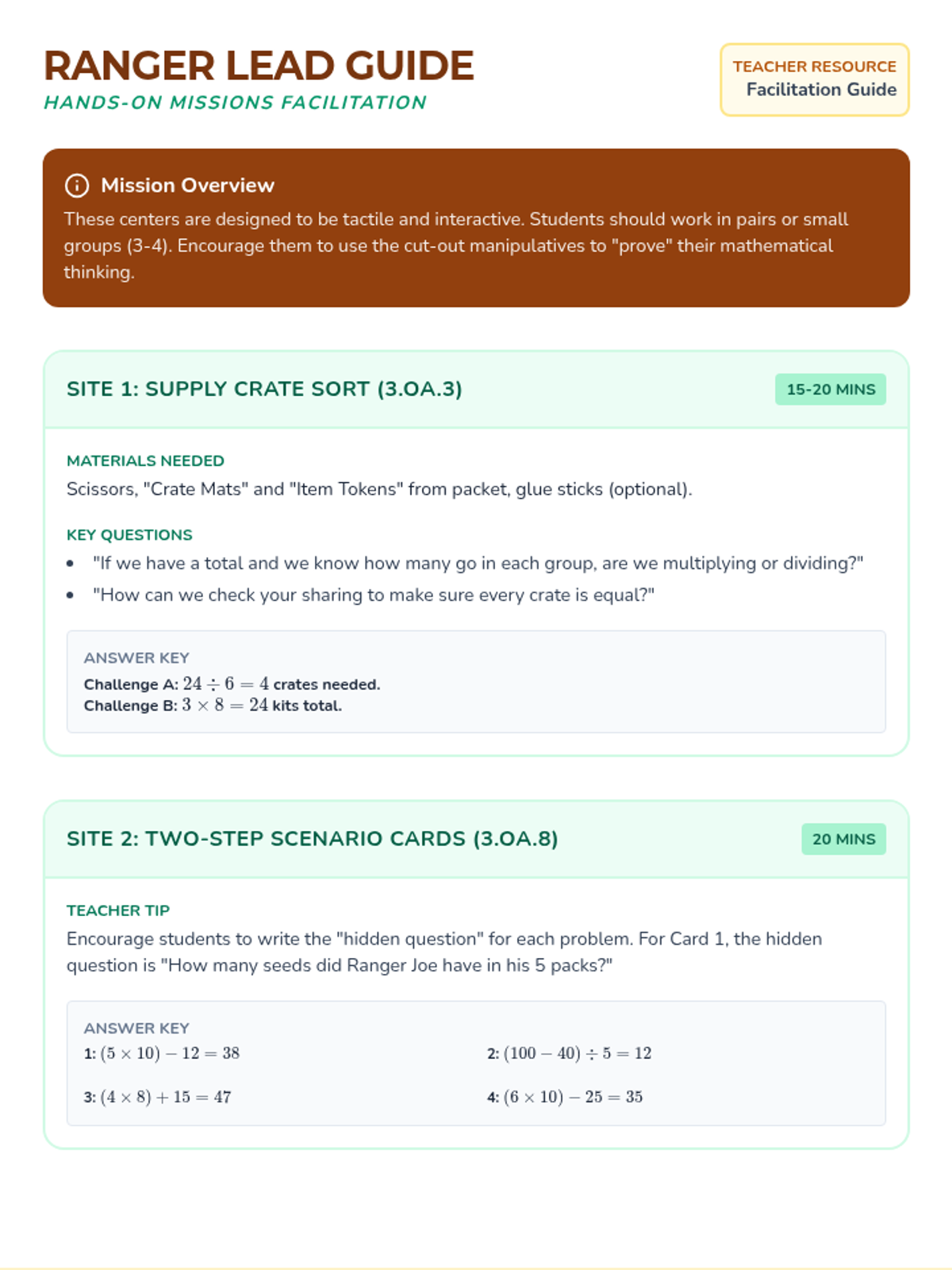 A 3-page teacher facilitation guide for the hands-on math centers. Includes setup instructions, materials lists, key discussion questions, and answer keys for all interactive activities, including expanded tasks.