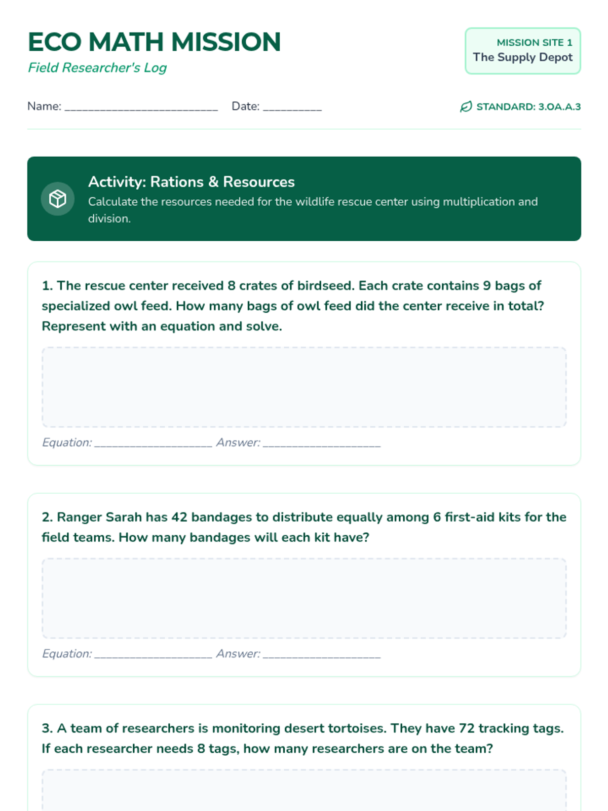 A 6-page student packet featuring wildlife-themed math centers. Each page focuses on a different Arizona 3rd grade math standard (3.OA.3, 3.OA.8, 3.NBT.2, 3.MD.7, 3.NF.2, 3.NF.3) with engaging, high-rigor problems. Now with corrected page breaks.