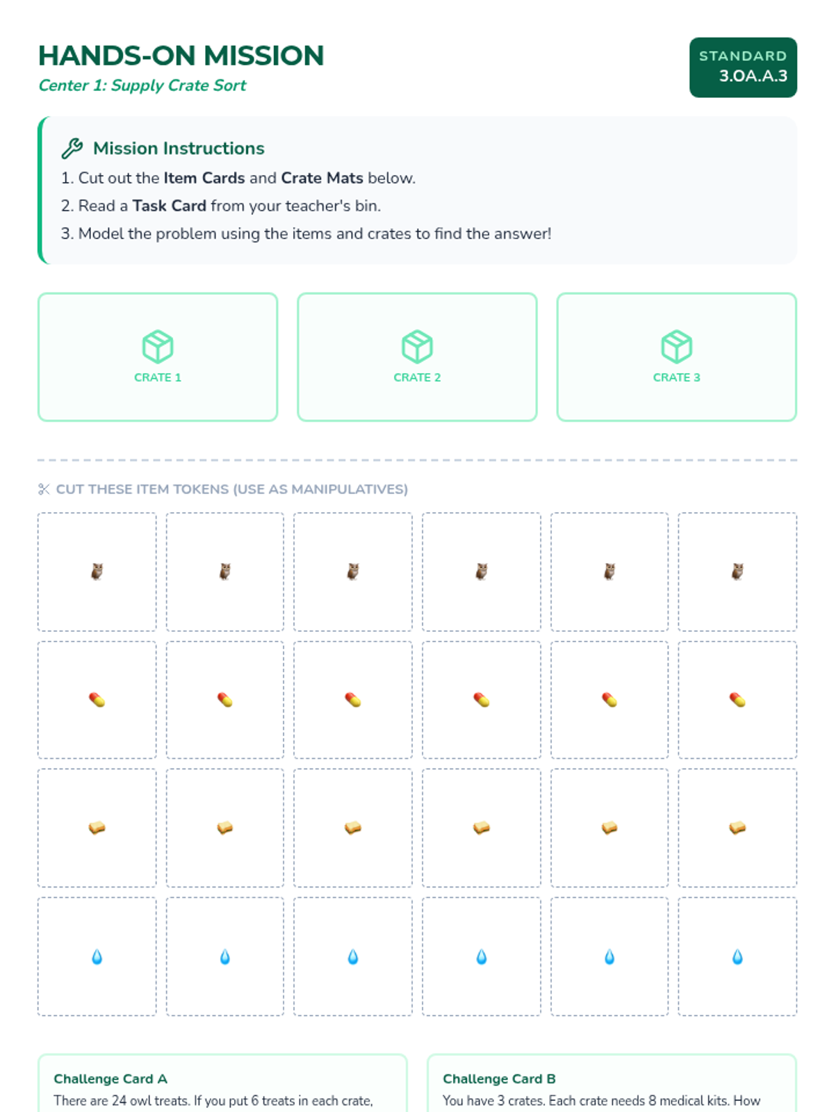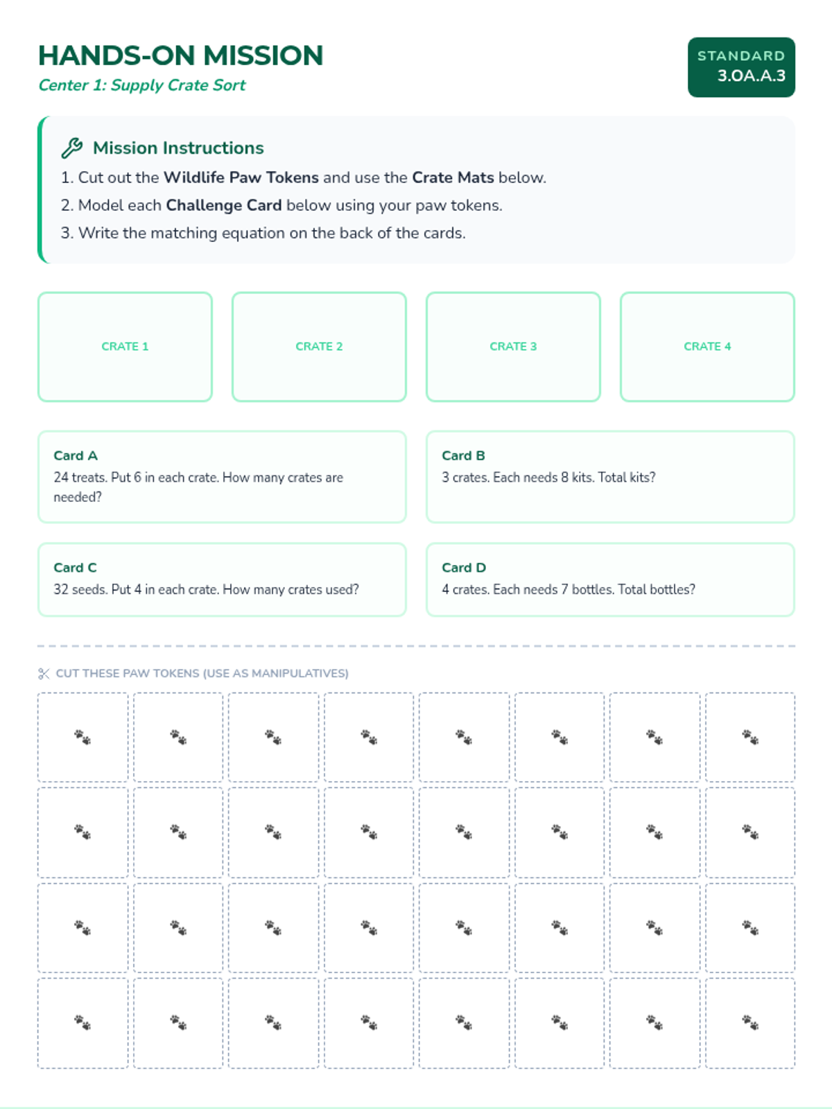 A 6-page student packet for hands-on math centers. Each page includes cut-out manipulatives and interactive tasks for Arizona 3rd grade math standards (multiplication/division sorting, two-step scenarios, dice-based addition, area tiles, number line placement, and equivalent fraction matching). Now with expanded tasks and fixed grids.