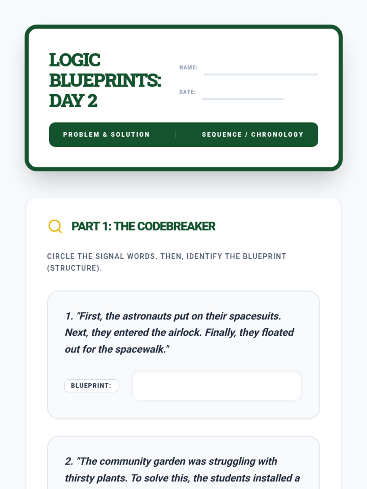 A guided practice worksheet for Day 2, focusing on identifying Problem/Solution and Sequence structures and completing corresponding graphic organizers.