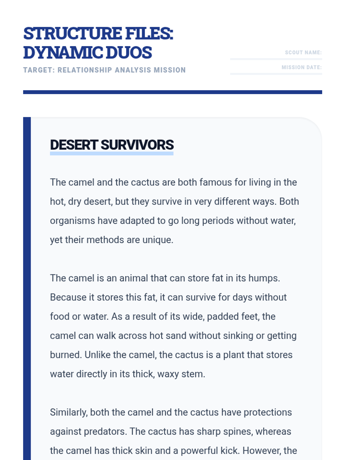 A reading passage about camels and cacti that incorporates both Compare/Contrast and Cause/Effect structures with comprehension questions.