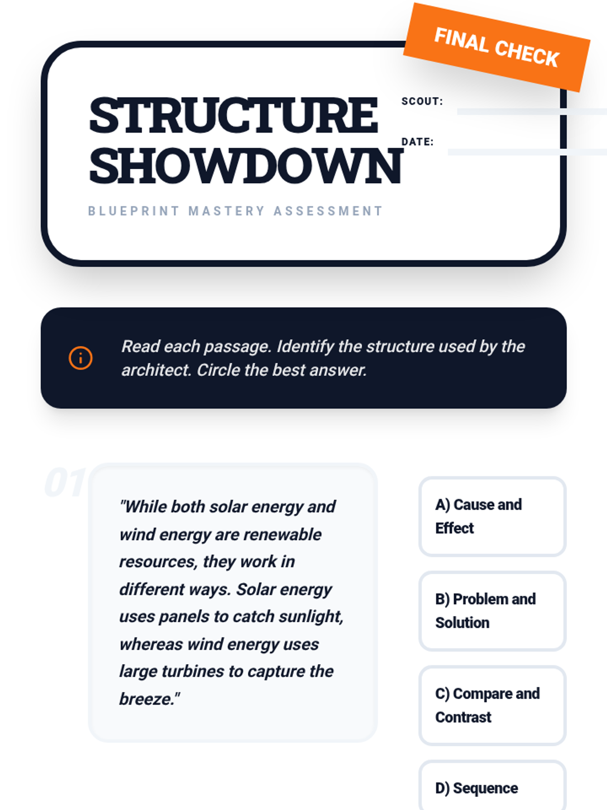 A 5-question quick check assessment covering all four informational text structures taught in the unit.