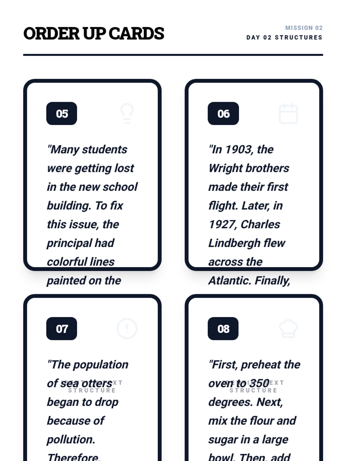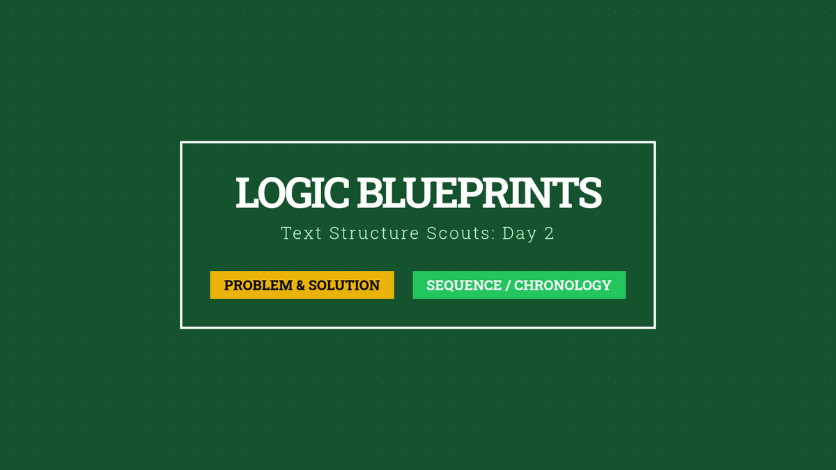 Day 2 slides introducing Problem/Solution and Sequence/Chronological structures with visual organizers and interactive practice examples.