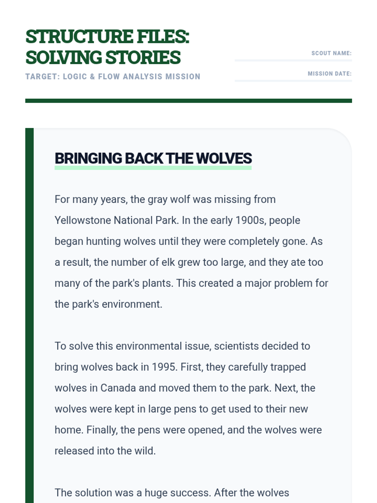 A reading passage about wolves in Yellowstone that demonstrates both Problem/Solution and Sequence structures with integrated comprehension questions.