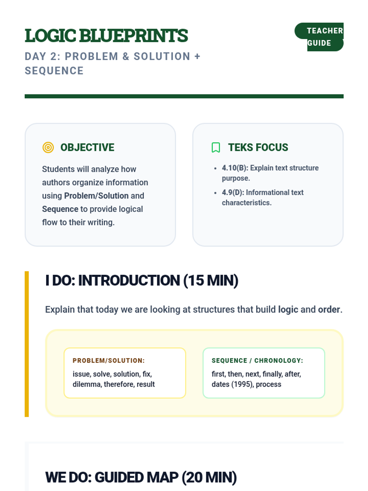 A detailed Day 2 lesson plan for teaching Problem/Solution and Sequence/Chronological structures, including discussion prompts and center activities.
