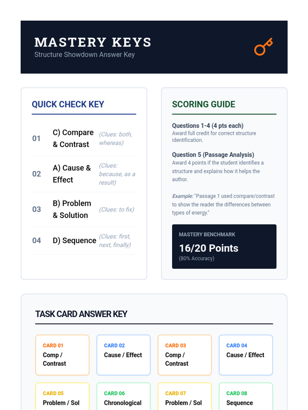 A comprehensive answer key and scoring guide for the Structure Showdown quiz and the center task cards.