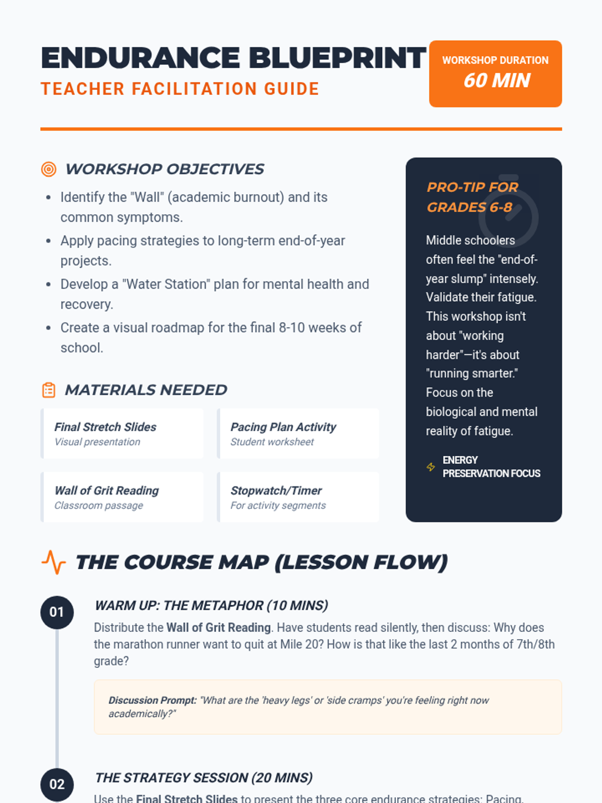 A comprehensive teacher facilitation guide for the Marathon Mindset workshop, including objectives, materials, and a timed lesson flow.