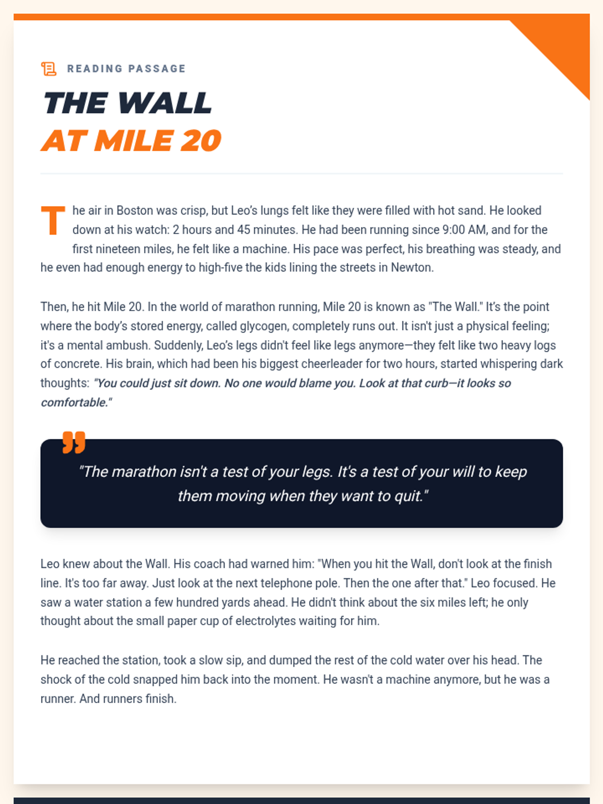 A narrative reading passage about a runner hitting "The Wall" at Mile 20, serving as a metaphor for the final quarter of the school year.
