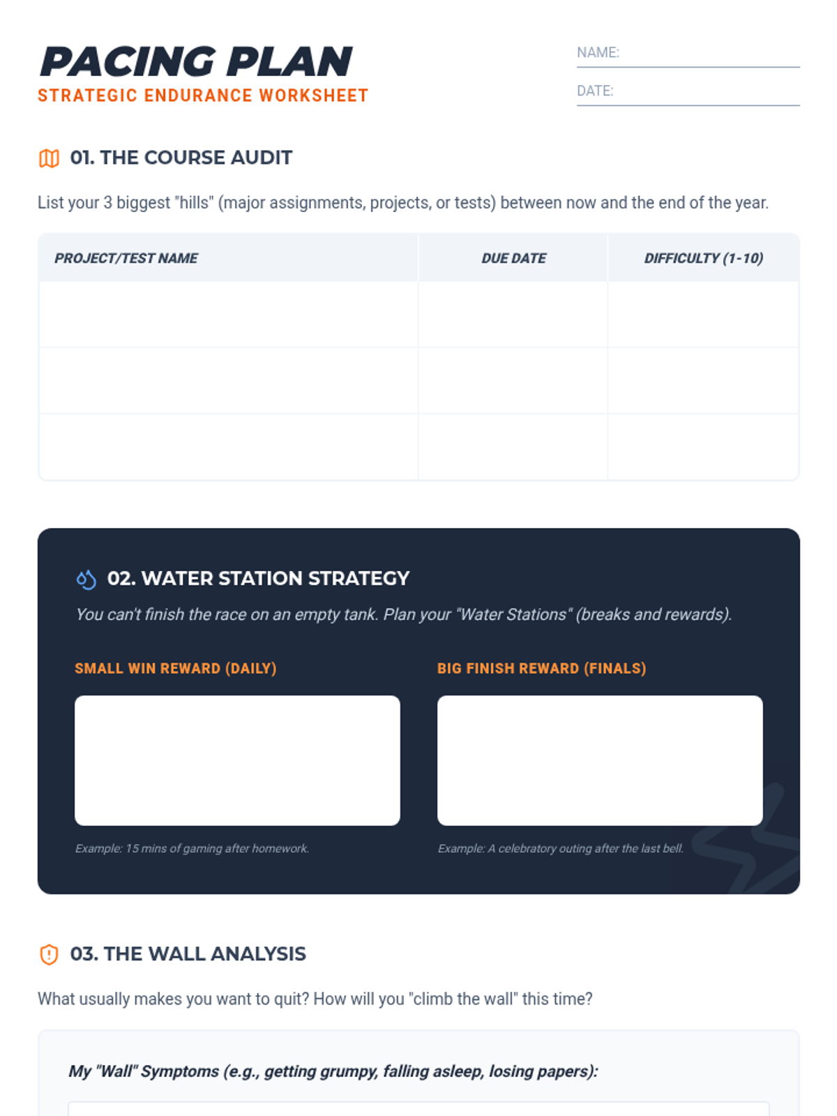 A practical student worksheet for auditing end-of-year projects and planning self-care "water stations" to maintain academic momentum.