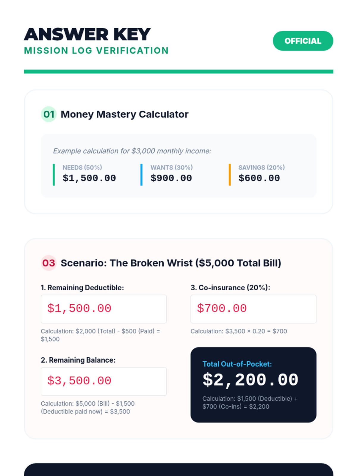 An answer key for the Mission Log Portfolio. Provides worked-out solutions for the 50/30/20 budget calculator, the health insurance 'Broken Wrist' scenario, and the tax pay stub breakdown.