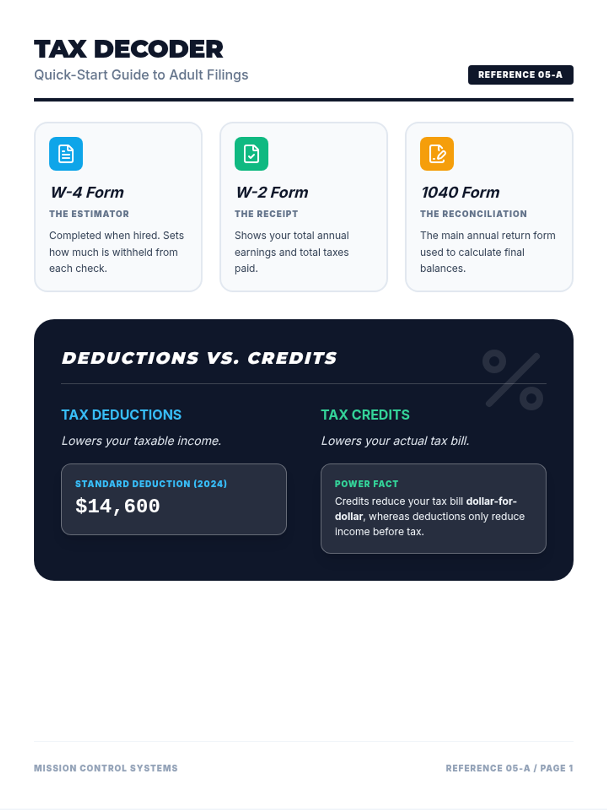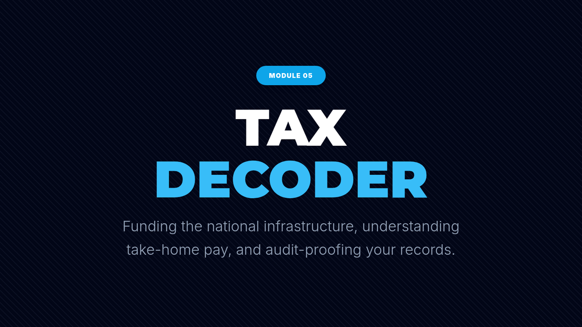 An expanded 7-slide presentation for Module 05: Tax Decoder. Explains the Form Trinity (W-4, W-2, 1040), Gross vs. Net reality, Deduction vs. Credit power moves, the W-4 Gambit, and Audit Defense strategies (record keeping).