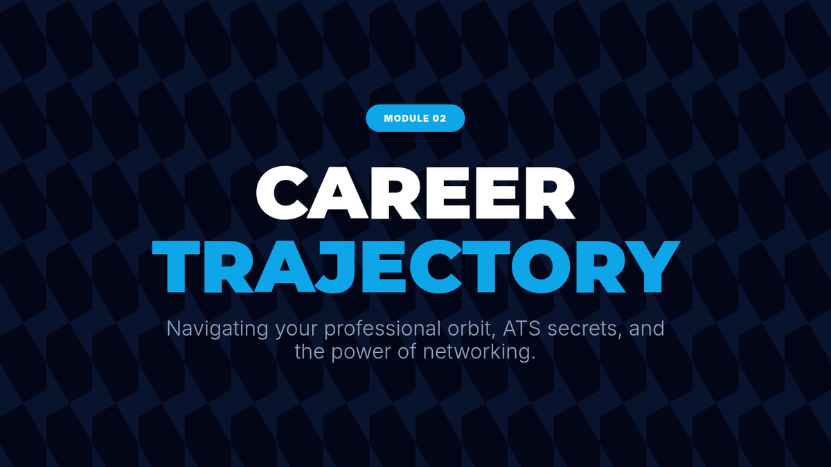 An expanded 7-slide professional presentation for Module 02: Career Trajectory. Explores resume vs. network, ATS bot secrets, the Elevator Pitch framework, the STAR method for interviews, and Professionalism 2.0 (etiquette and reliability).