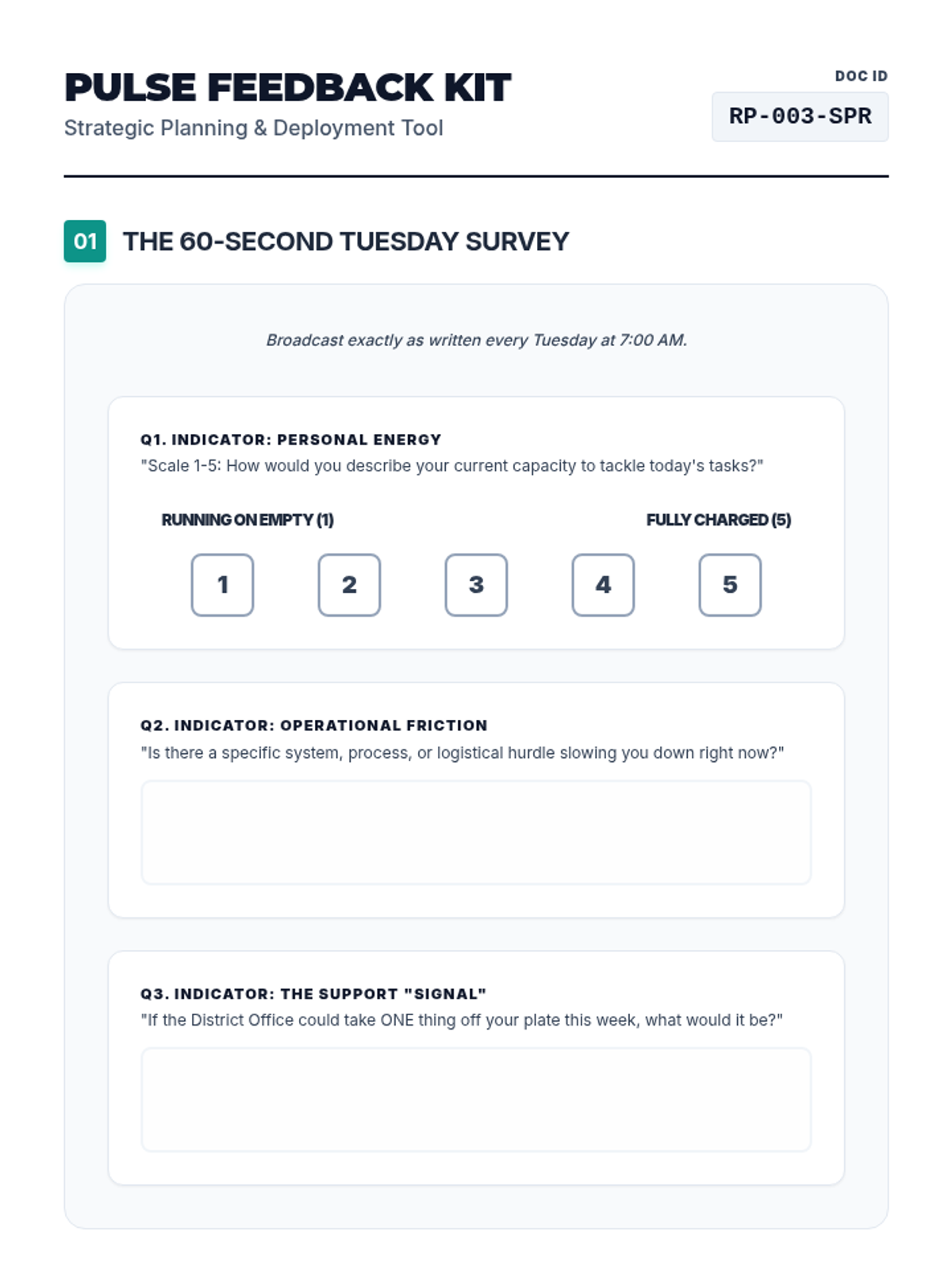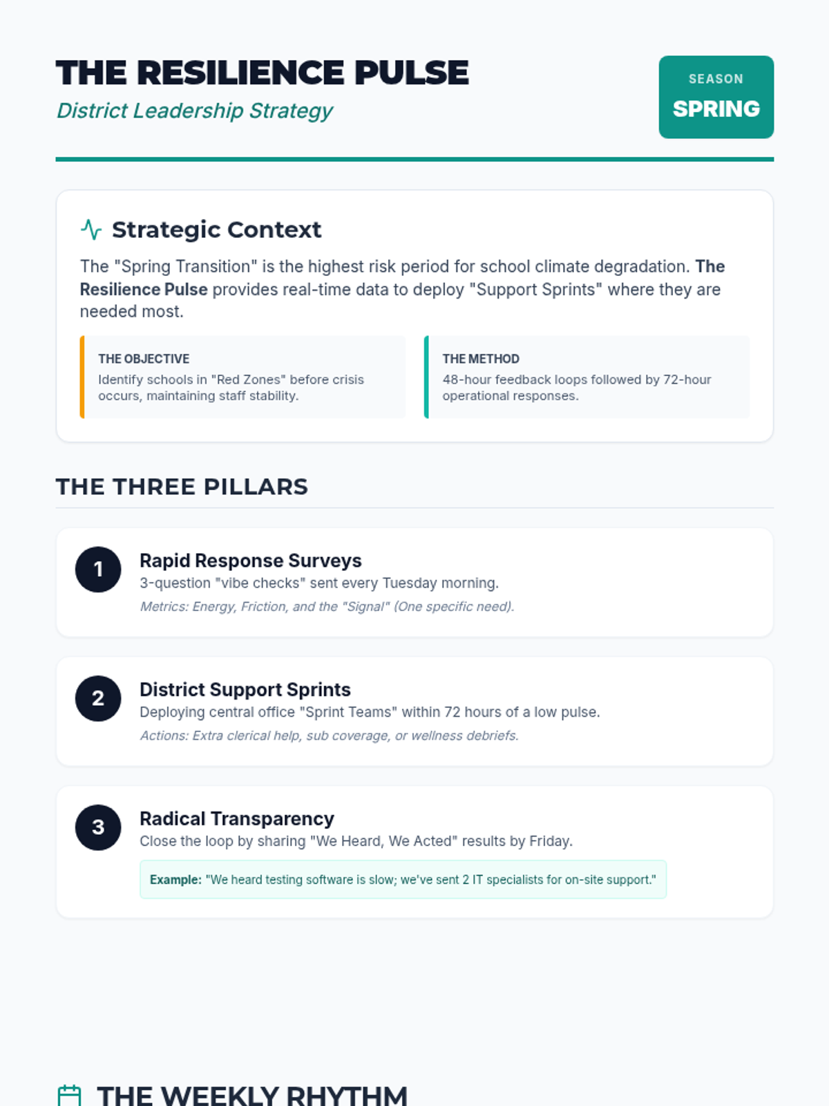 A strategic facilitation guide for district leaders outlining the Resilience Pulse framework, including implementation pillars, weekly rhythms, and response strategies.