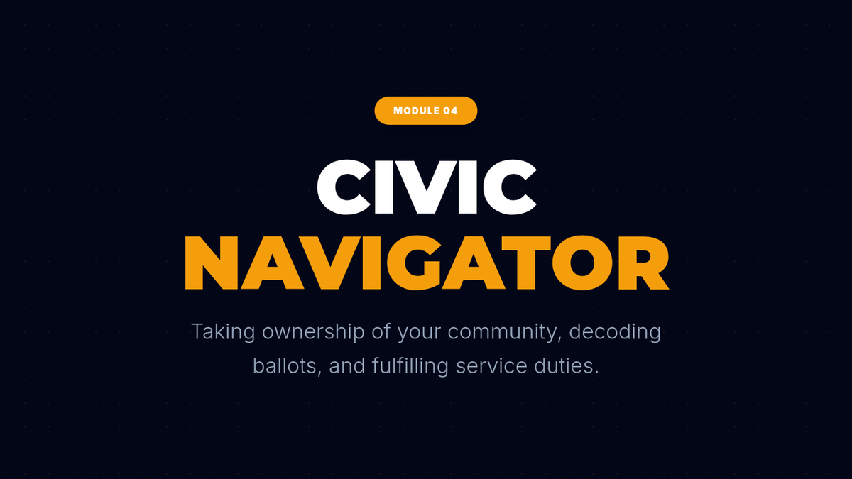 An expanded 7-slide presentation for Module 04: Civic Navigator. Covers community ownership, registration logic (citizenship, Selective Service), decoding ballot propositions, the influence grid (Local vs. State vs. Fed), and jury duty requirements.