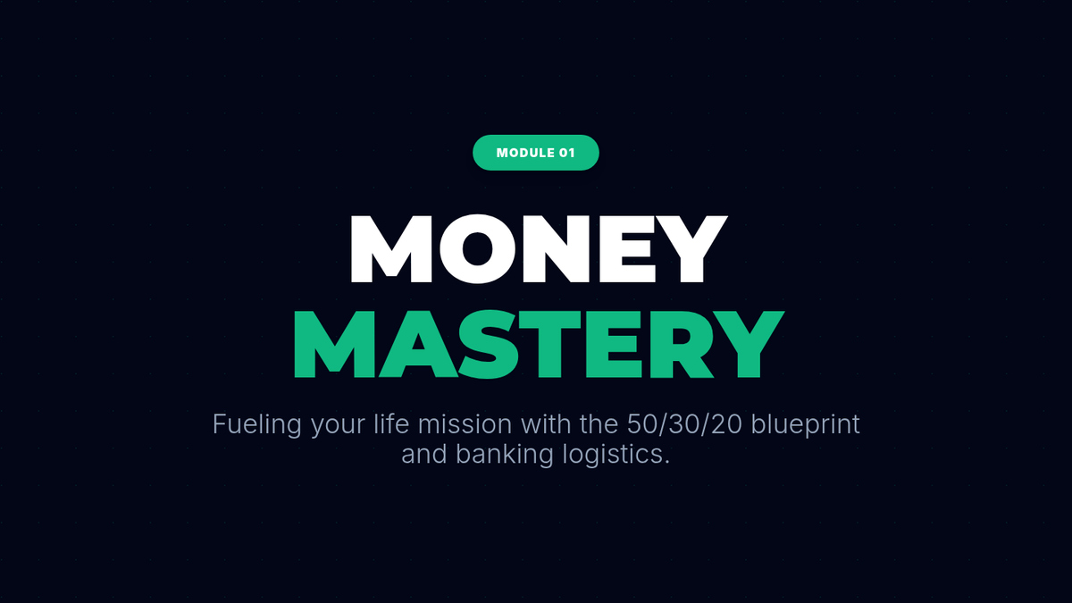 An expanded 7-slide deep-dive presentation for Module 01: Money Mastery. Covers the 50/30/20 rule, banking logistics (Checking vs Savings vs HYSA), credit score DNA, compound interest math, and debt types.