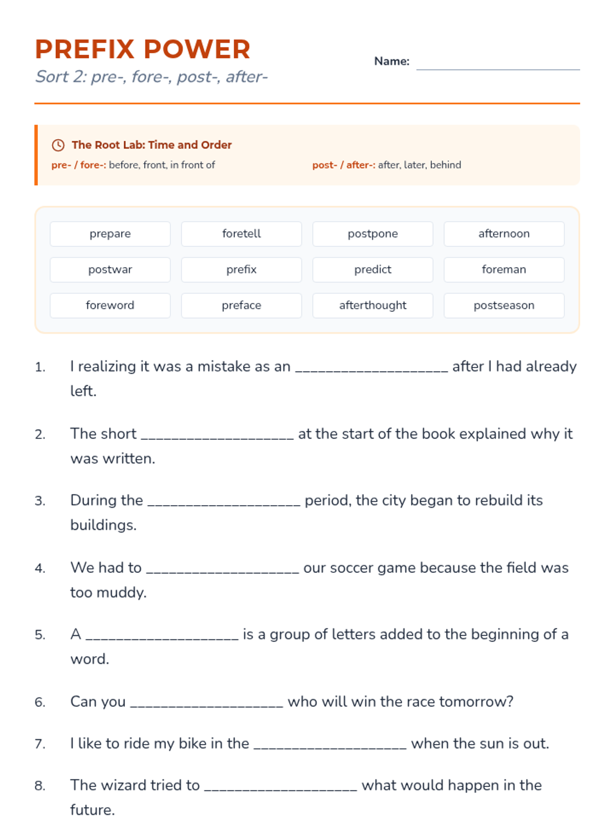 A 2-page fill-in-the-blank worksheet for Spelling Sort 2, focusing on the prefixes pre-, fore-, post-, and after-. Includes root definitions and 24 practice sentences.