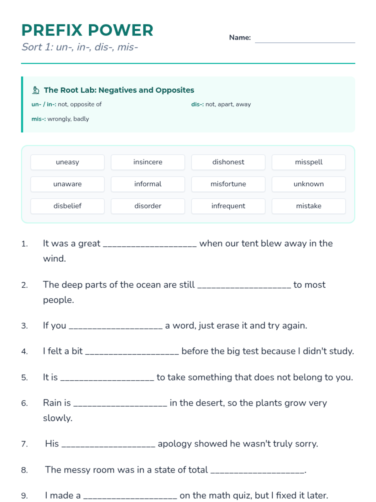 A 2-page fill-in-the-blank worksheet for Spelling Sort 1, focusing on the prefixes un-, in-, dis-, and mis-. Includes root definitions and 24 practice sentences.