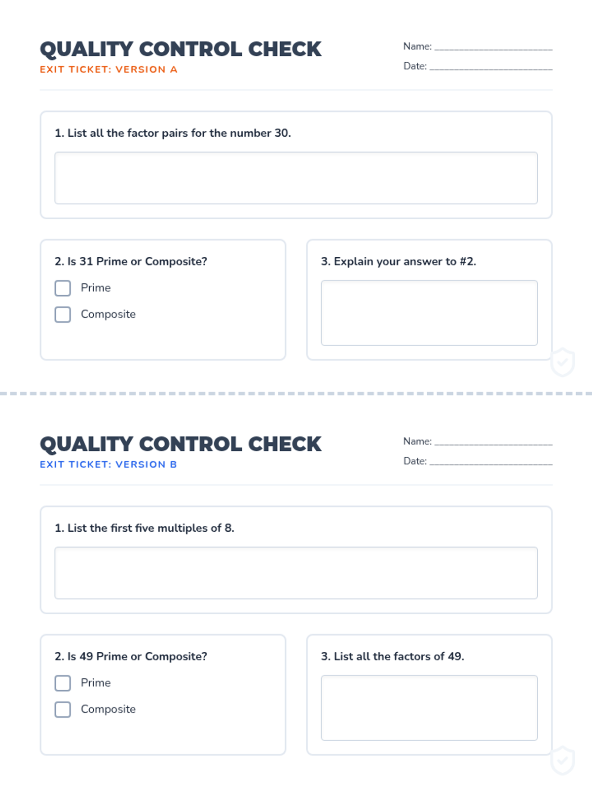 Two versions of exit tickets for a quick check on factor pairs, multiples, and the prime vs. composite distinction. Designed for easy printing and cutting.