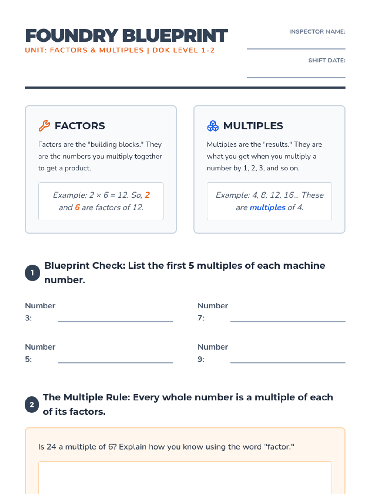 A 3-page scaffolded packet introducing factors, multiples, and the distinction between prime and composite numbers. Includes step-by-step guides for finding factor pairs and classifying numbers.