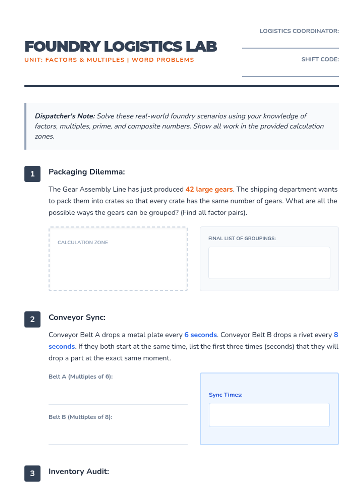 A collection of industrial-themed word problems applying factors, multiples, and prime/composite number concepts to foundry logistics and scheduling.