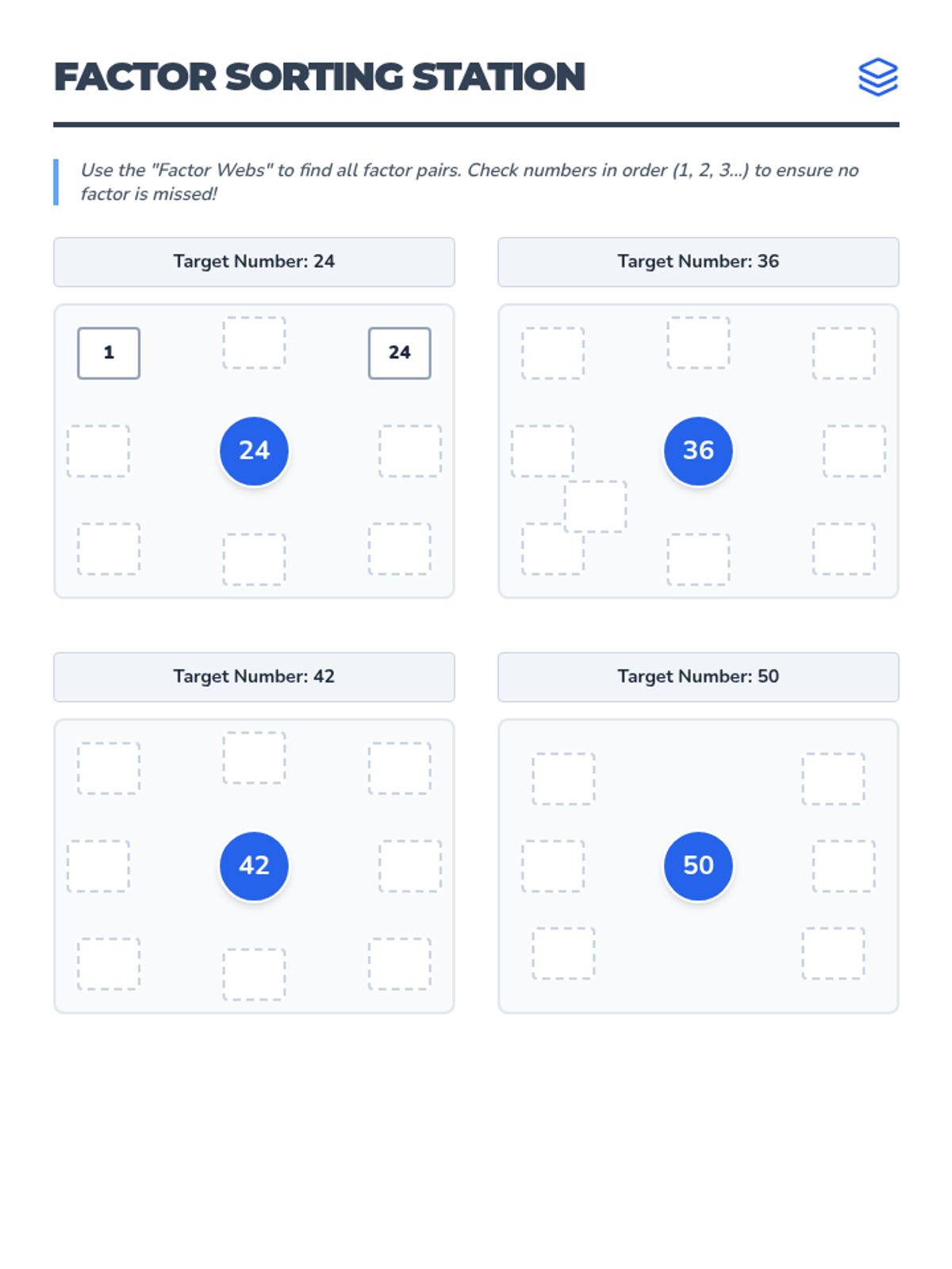 Graphic organizers including factor webs for numbers up to 50 and a prime vs. composite sorting activity for auditing number classifications.