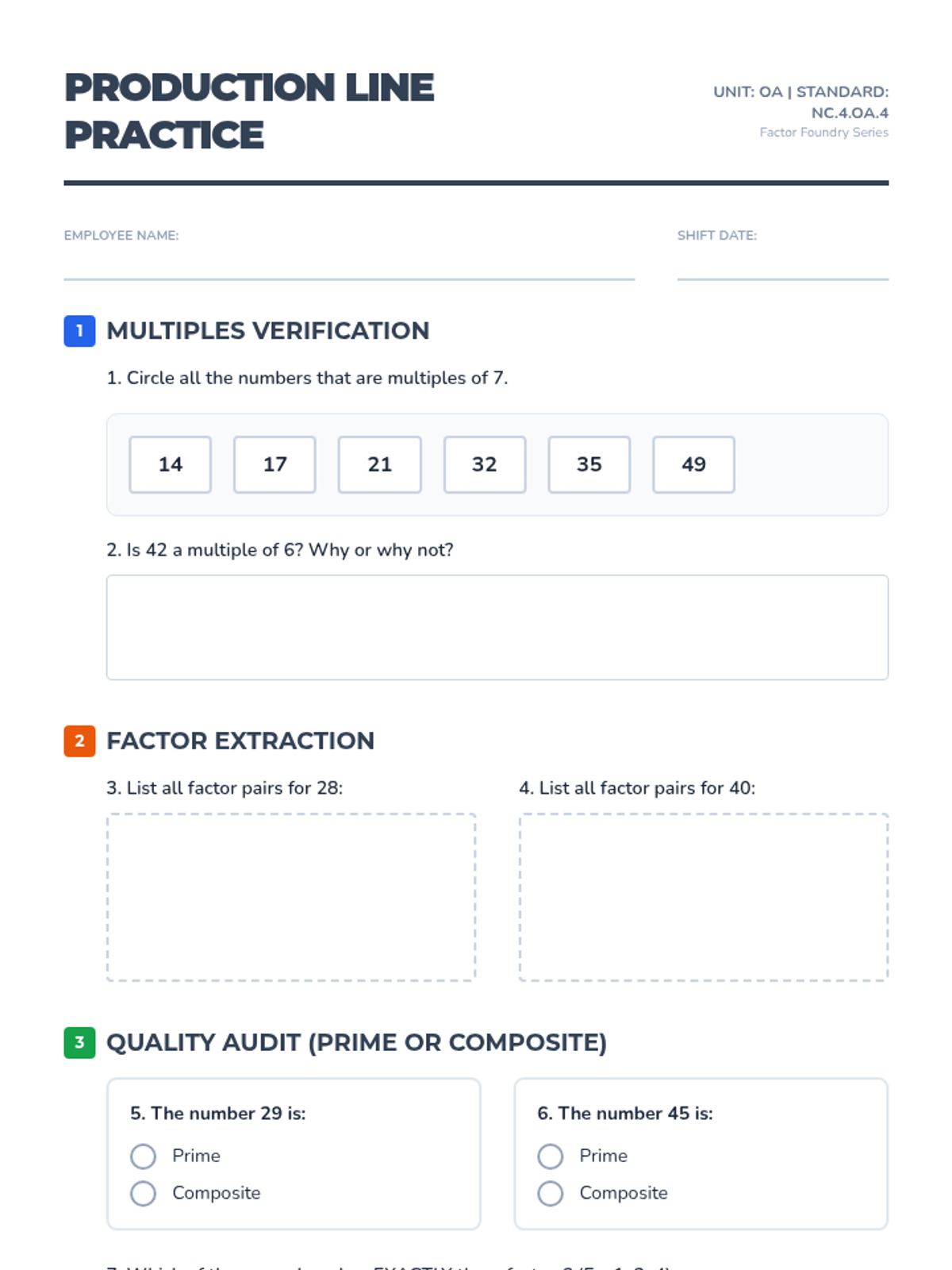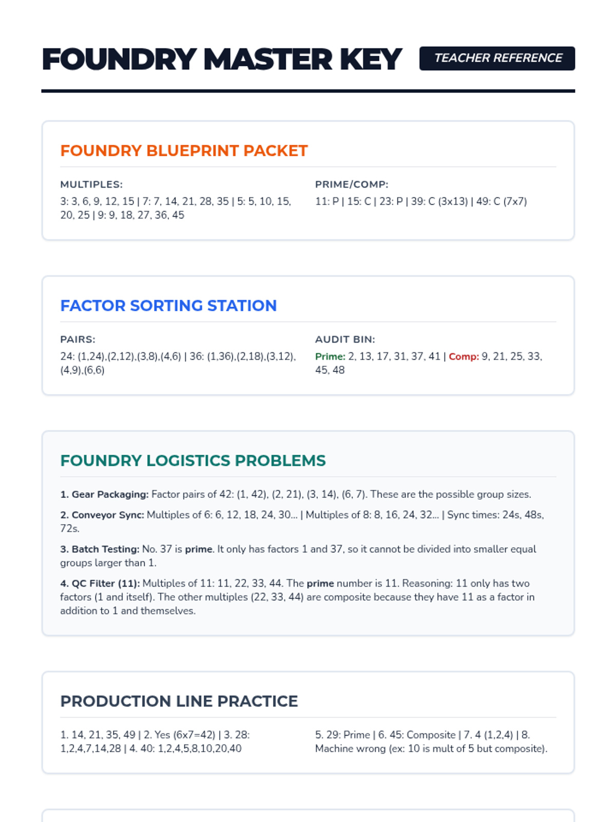 A consolidated teacher answer key for all materials in the Factor Foundry lesson, including the packet, sorting station, practice sheet, exit tickets, and logistics word problems.