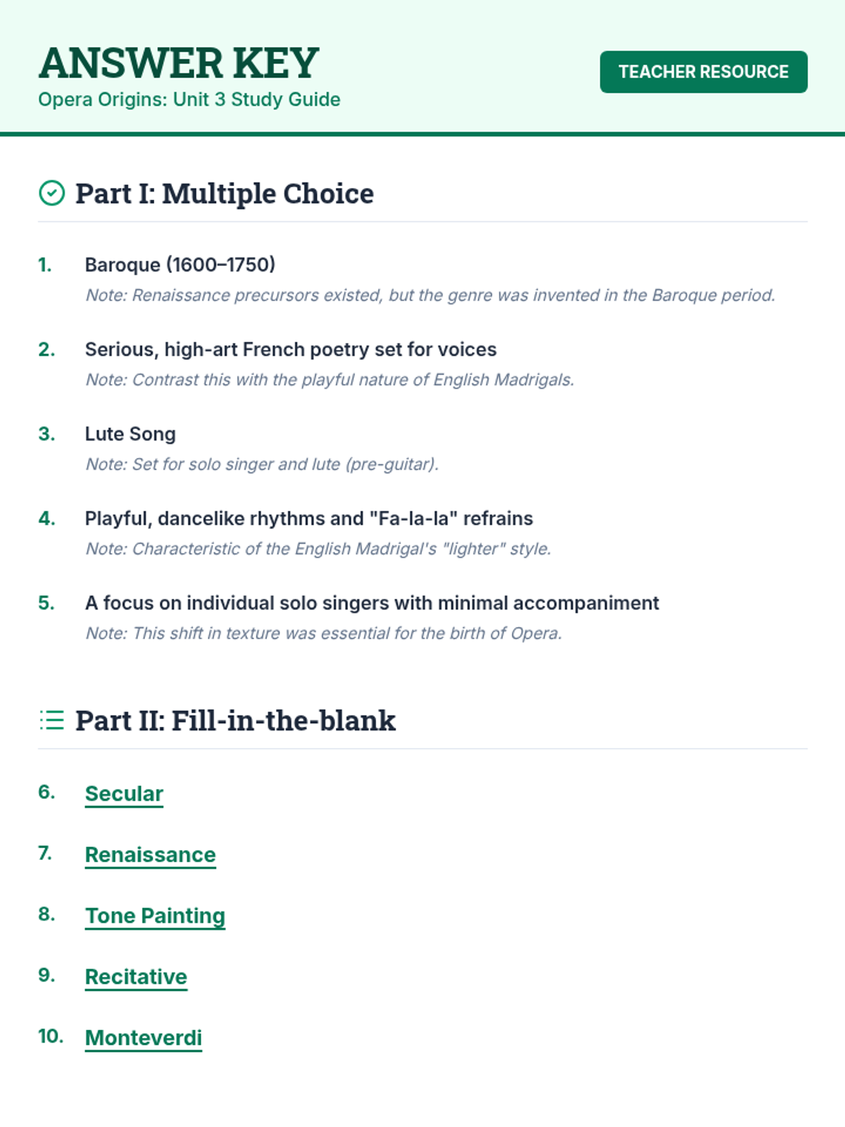 A teacher's answer key for the Opera Origins study guide, including correct responses and brief instructional notes for each question.