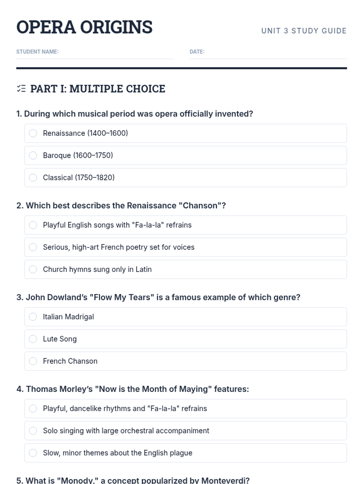 A comprehensive study guide for students covering the precursors to opera, including multiple-choice and fill-in-the-blank questions based on Renaissance vocal forms and early Baroque developments.