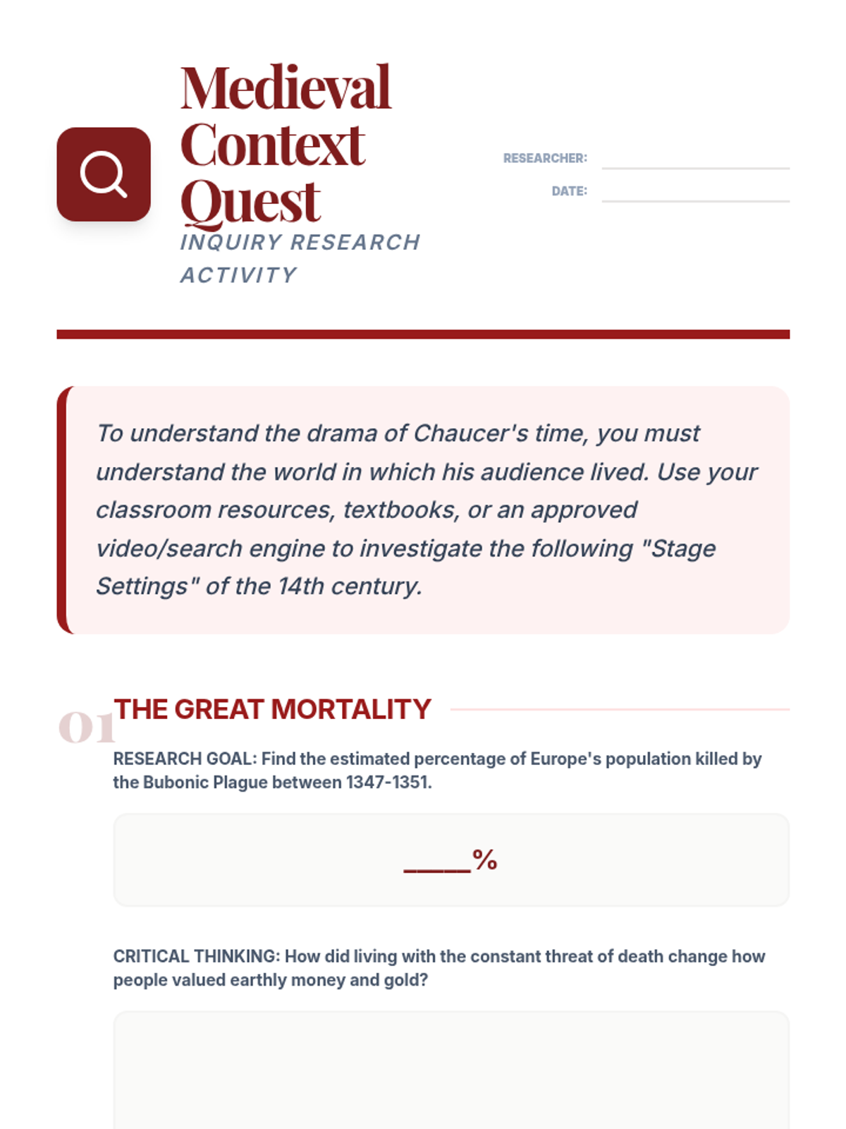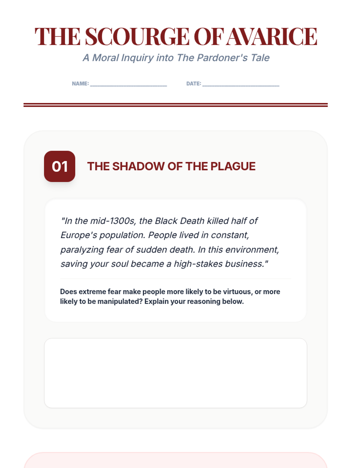 A high-rigidity inquiry activity for 9th graders connecting the historical desperation of the Black Death to the psychological themes of manipulation and greed in Chaucer's work.