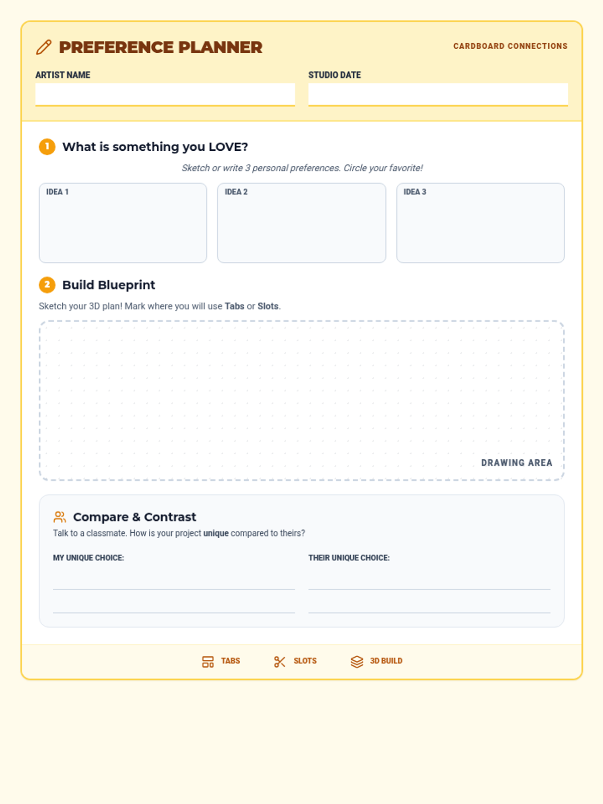 A student planning worksheet for the 'Cardboard Connections' lesson. It guides students through brainstorming personal preferences, sketching a 3D blueprint with construction techniques, and reflecting on how their artistic choices differ from their classmates'.