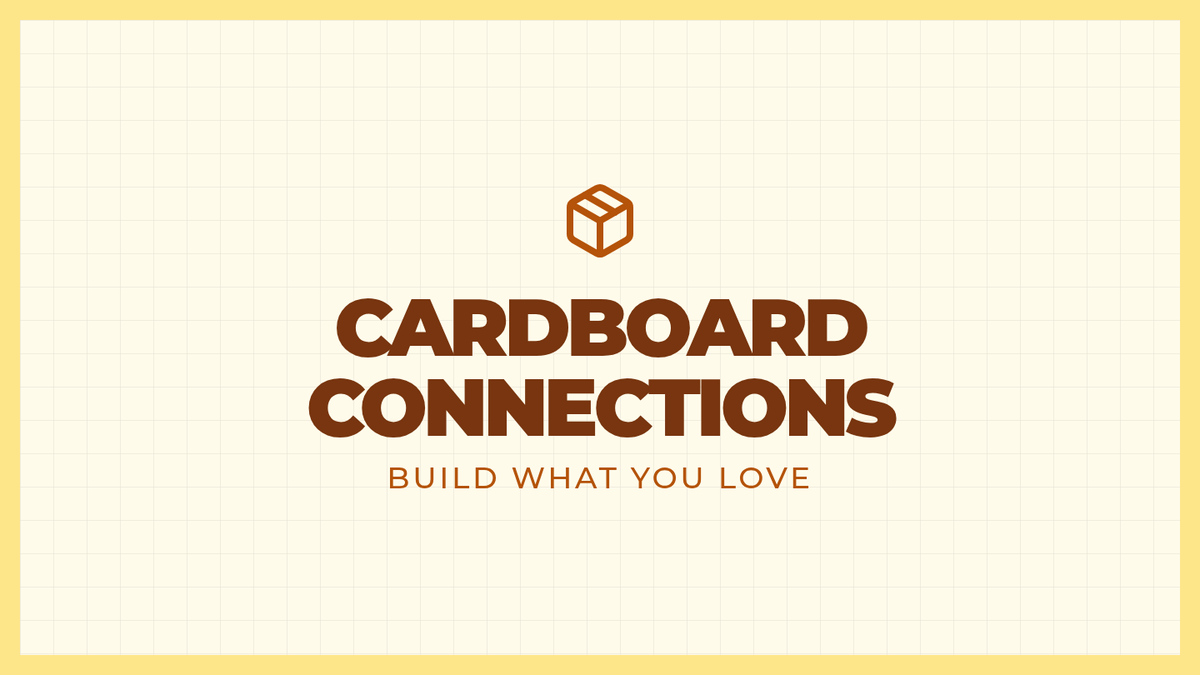 A vibrant slide deck for the 'Cardboard Connections' lesson. It includes visual prompts for personal preferences, step-by-step cardboard construction technique demonstrations (tabs and slots), and reflective discussion questions for the end of the studio session.