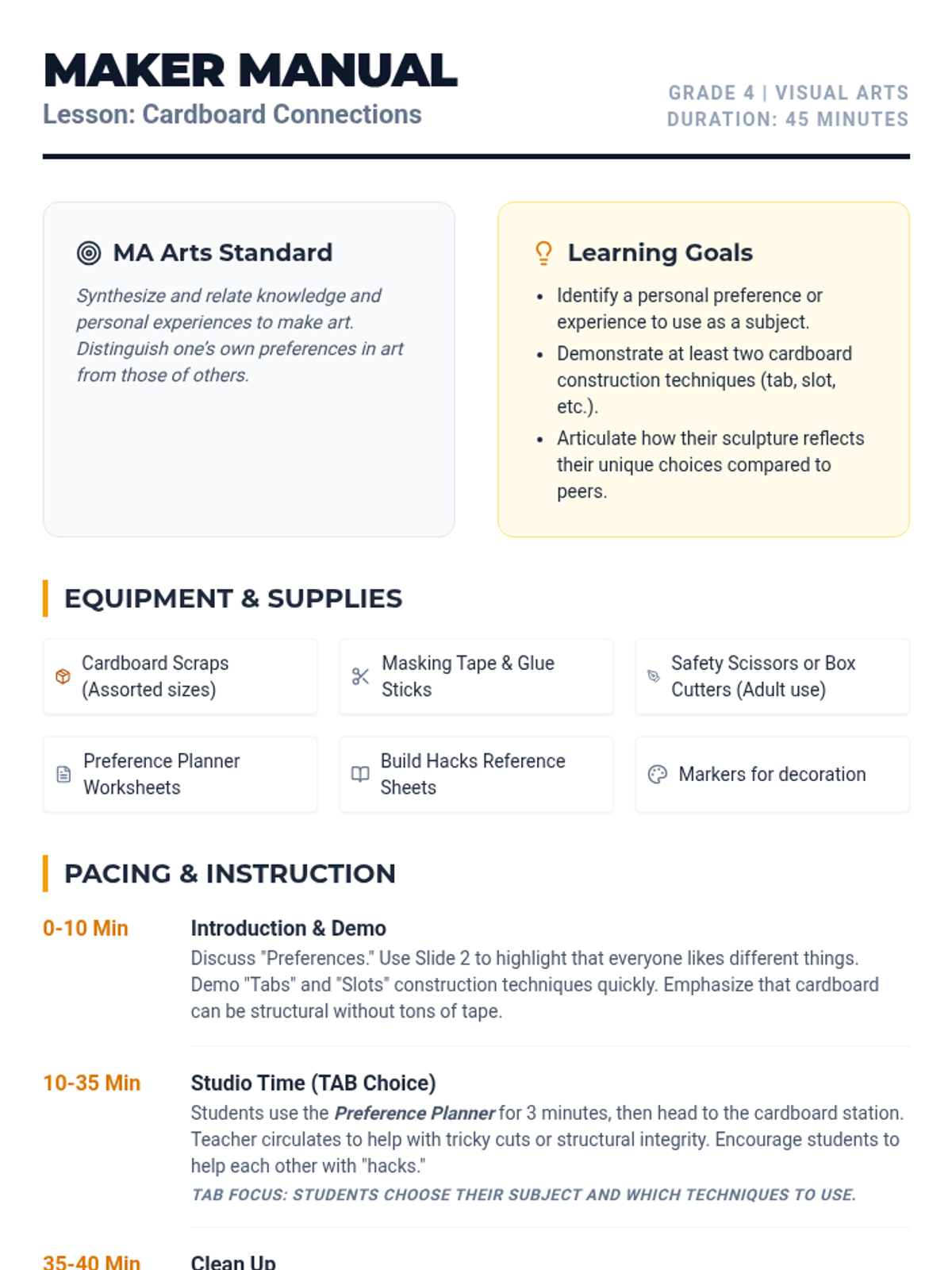 A comprehensive teacher guide for the 'Cardboard Connections' lesson. It details the MA standard alignment, a 45-minute pacing guide, materials list, and pedagogical tips for implementing choice-based TAB instruction with 4th-grade students.