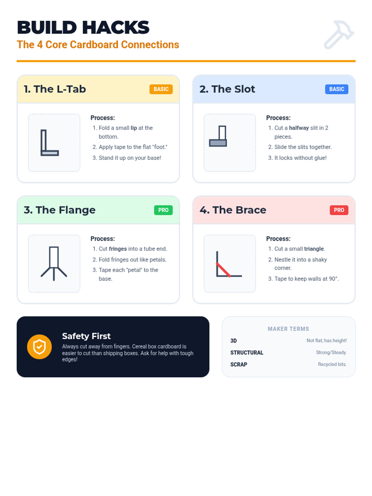 A visual reference guide showing four key cardboard construction techniques: L-Tabs, Slots, Flanges, and Braces. Each technique includes a clear schematic and step-by-step instructions for 4th-grade students to follow in the studio.