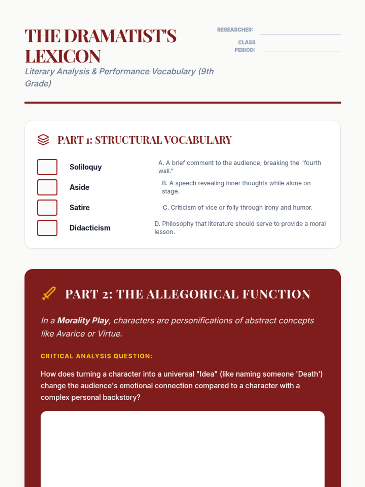 An advanced 9th-grade worksheet focusing on structural drama devices, the function of allegory, and the analysis of subtext in performative texts.