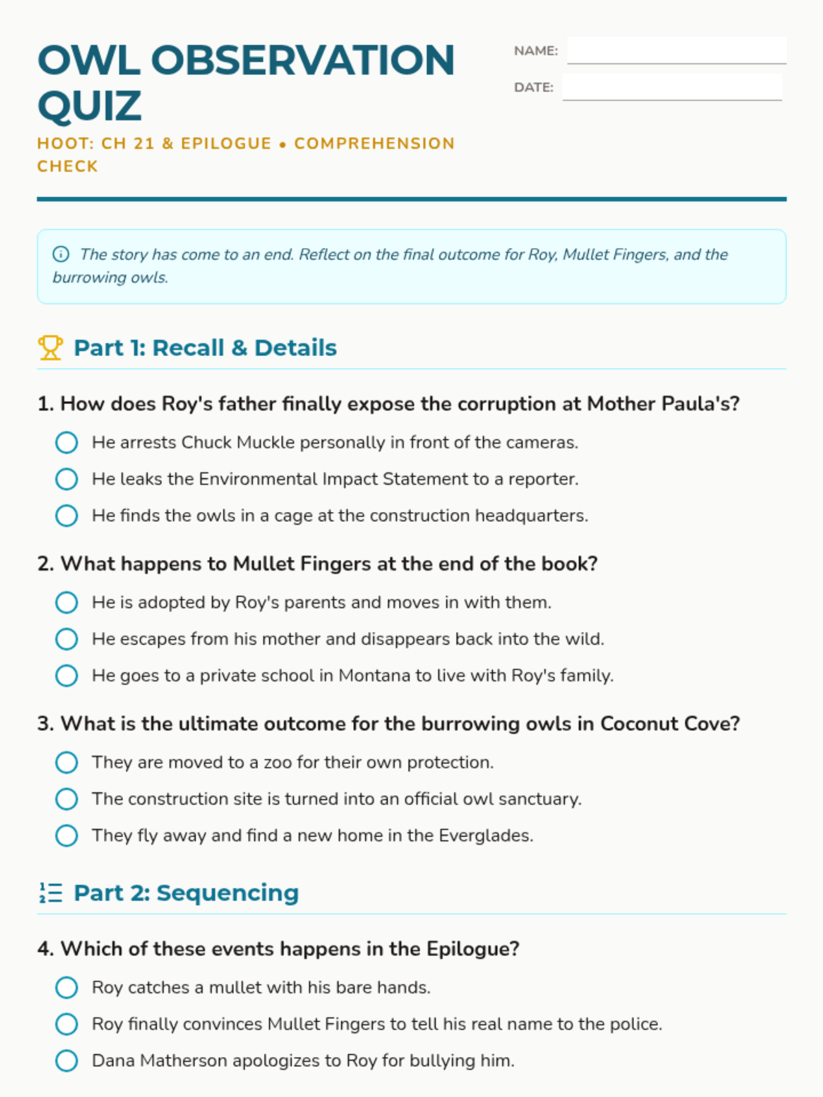 A clean, 3-option multiple choice comprehension quiz for the final chapter and epilogue of Hoot, covering the resolution of the conflict and the fate of the characters.