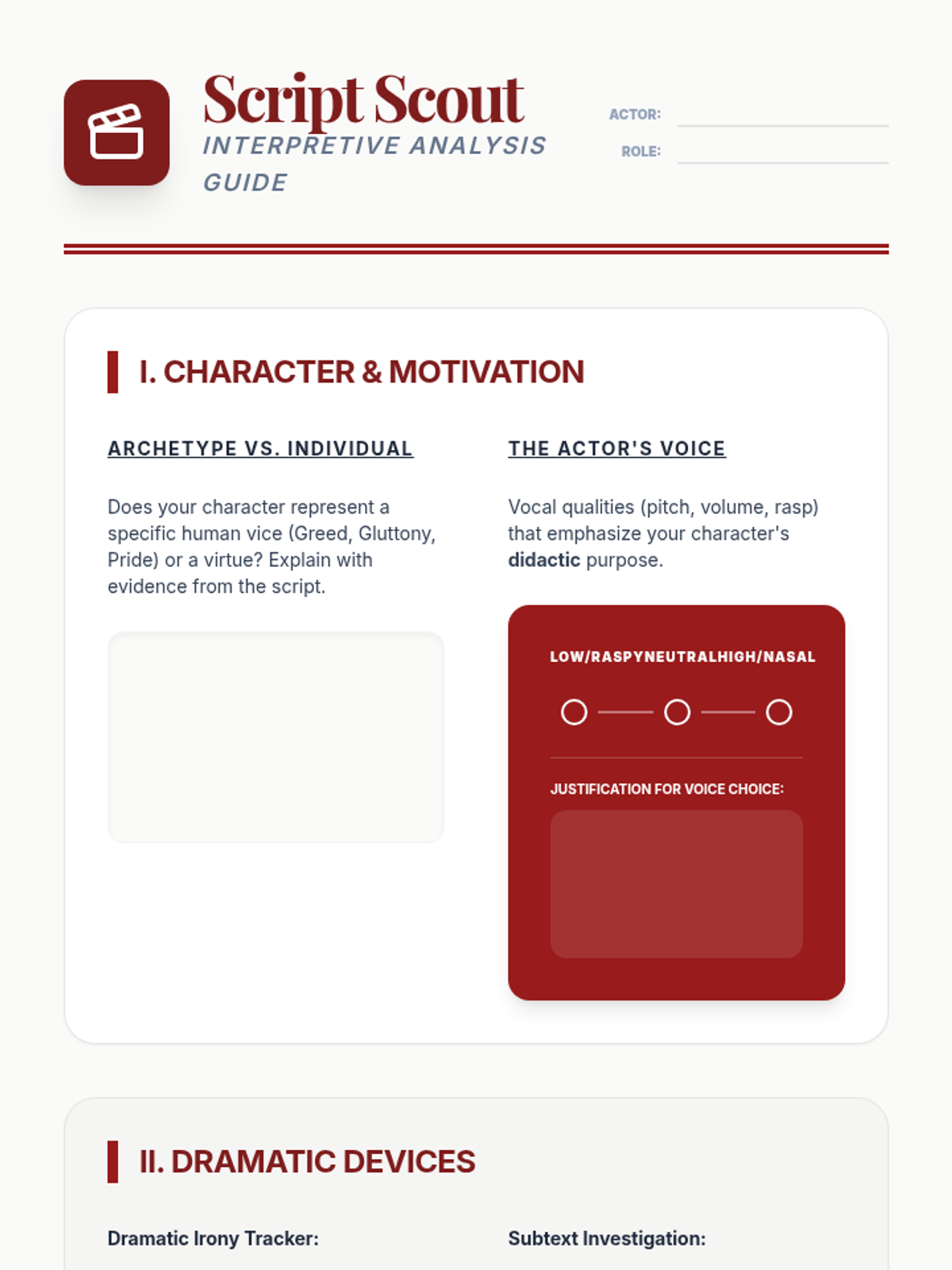 A rigorous 9th-grade graphic organizer for analyzing character motivation, dramatic irony, subtext, and the didactic function of scripts during a performance.