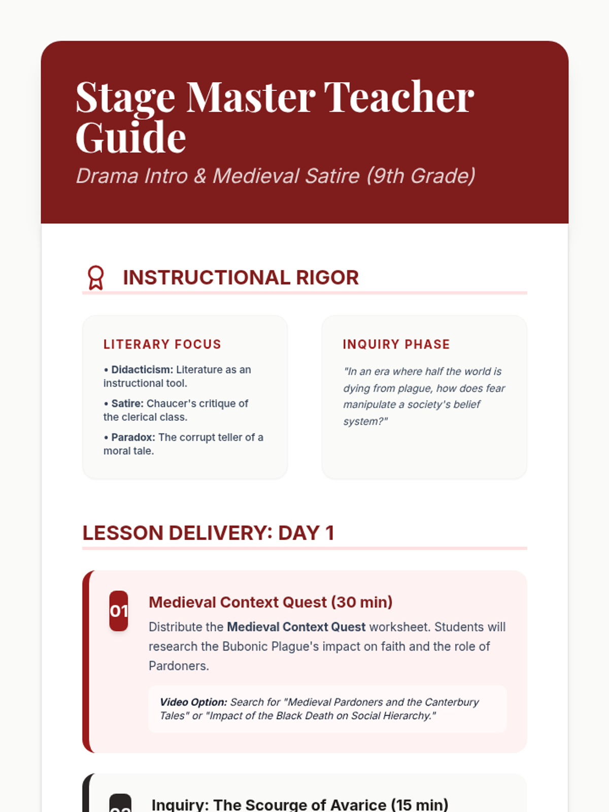 A high-level teacher's guide for 9th-grade drama instruction, connecting Chaucer's satirical techniques to performance pedagogy and historical inquiry.