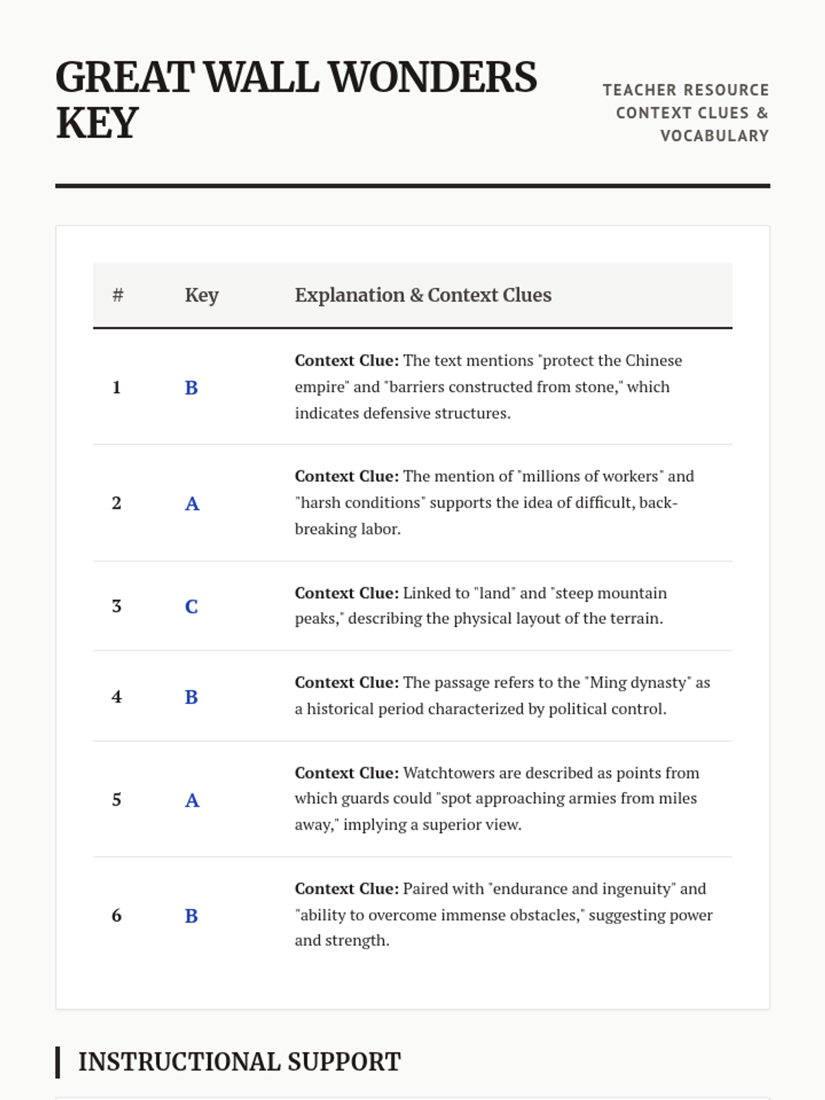 A detailed answer key and teacher resource for the Great Wall Wonders reading passage, providing explanations for context clues and vocabulary extension ideas. Revised for completeness and better layout.