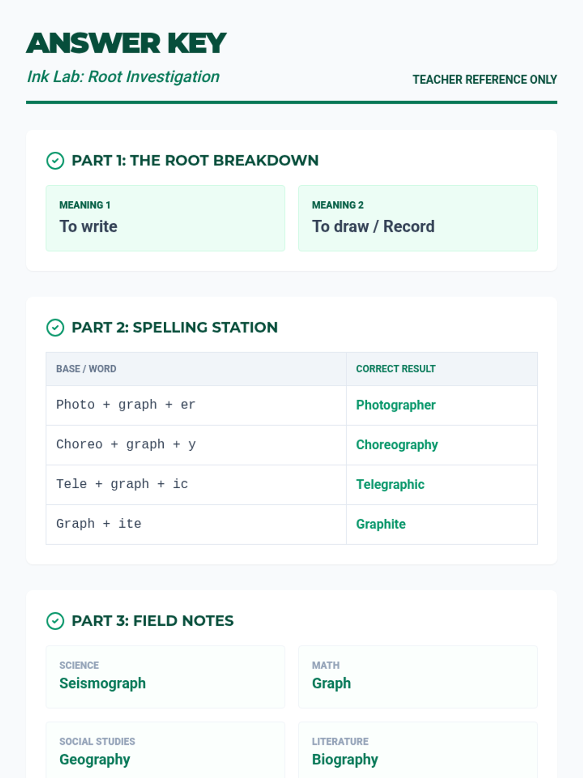 An answer key for the 'Ink Lab' worksheet, providing correct responses for root meanings, spelling variations, and cross-curricular terminology.