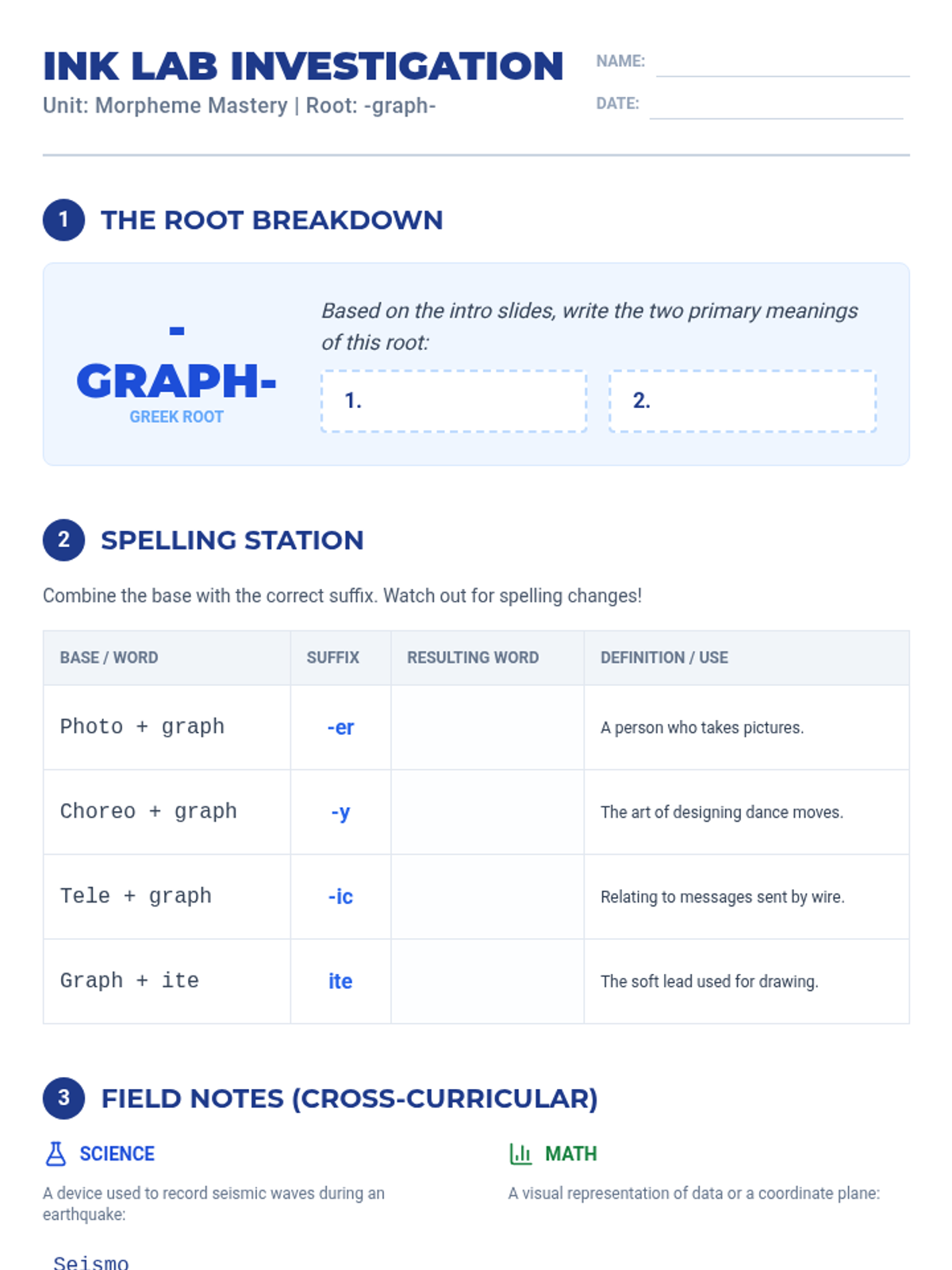 A student-facing worksheet for practicing the 'graph' morpheme, featuring root identification, spelling practice with suffixes, and cross-curricular application.