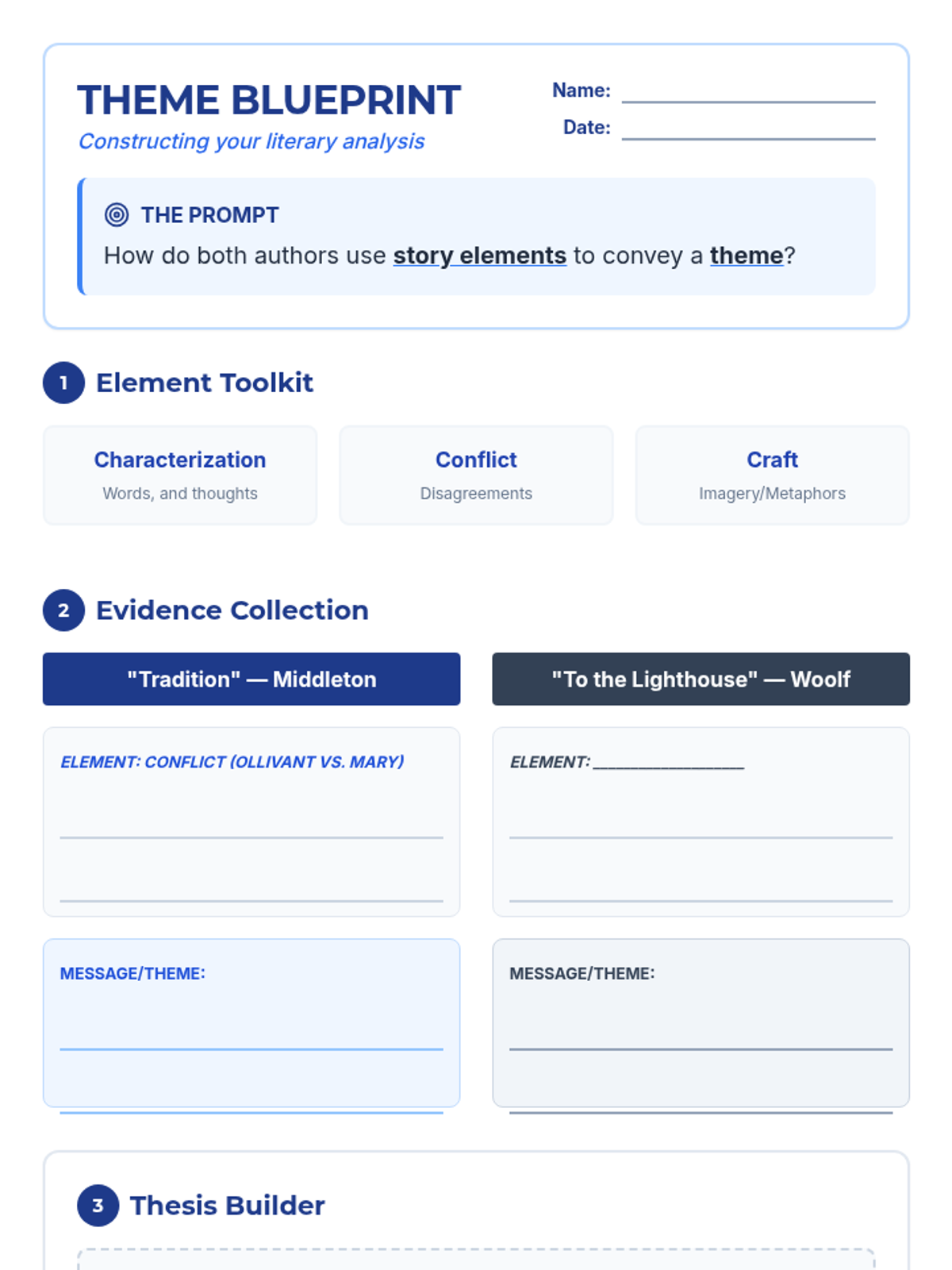 A two-page scaffolded worksheet designed for Tier 3 8th-grade students, providing a structured blueprint for analyzing story elements and themes in 'Tradition' and 'To the Lighthouse'.